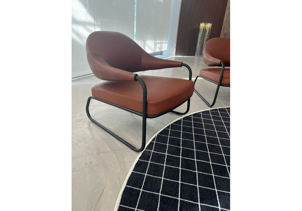 Lolla designed by Carlo Colombo for Antonio Lupi is an armchair made with a black lacquered metal frame and natural leather upholstery.