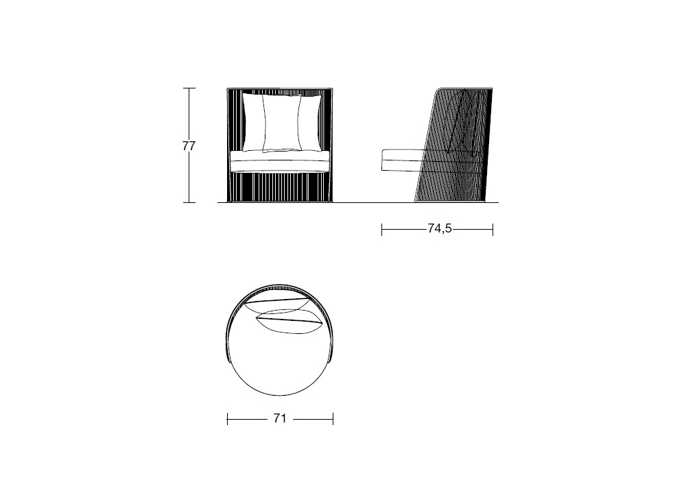 Joelle designed by Carlo Colombo for Antonio Lupi is an armchair made with a circular metal ring and fabric upholstery.