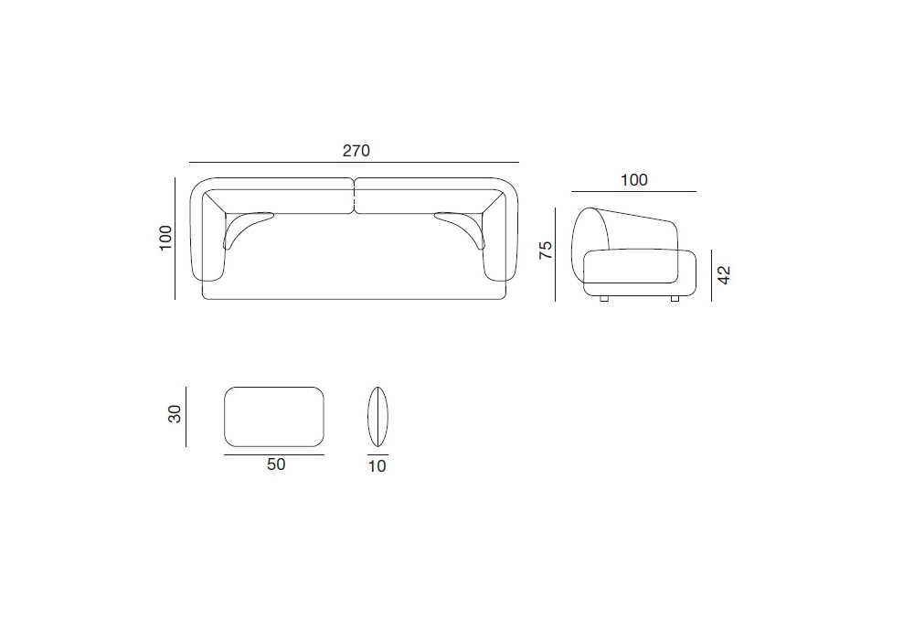 Kamari, designed by Paolo Grasselli for Twils, is a sofa with polyurethane padding, fabric upholstery, and wooden feet. Cushion 50 x 30 cm Boucle 101.