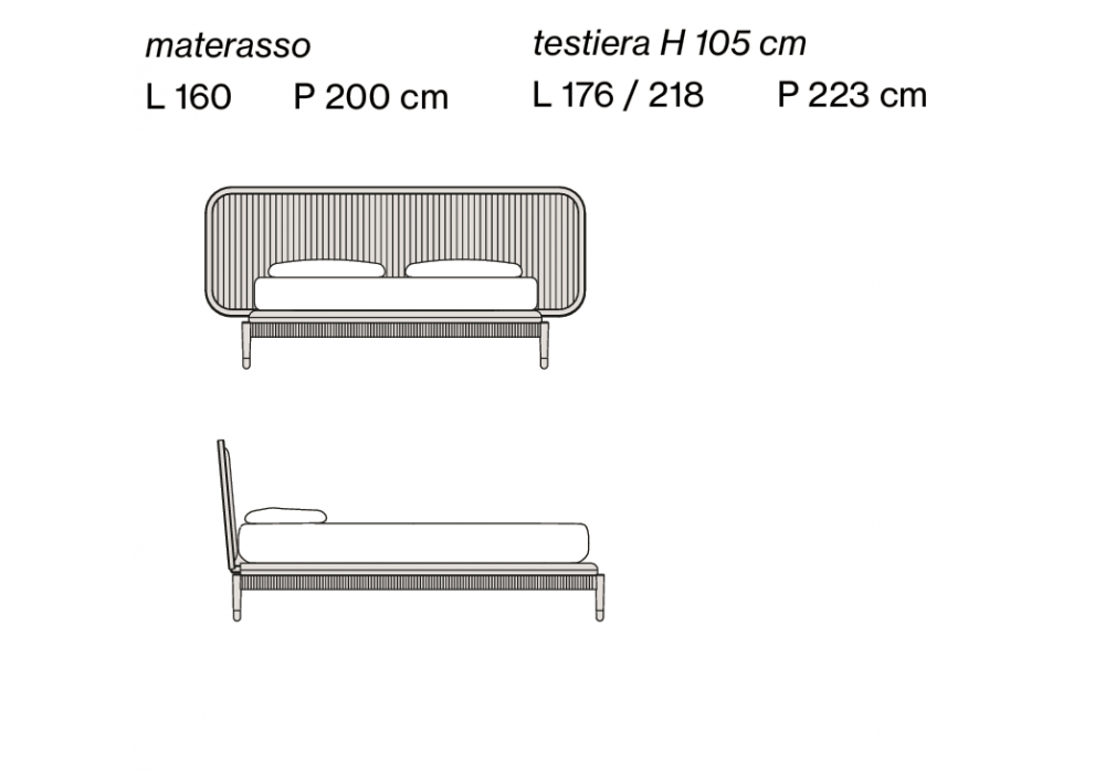 Amante Plissé designed by Cristina Celestino for Pianca is a bed with a lacquered bed frame and a pleated fabric-covered headboard.