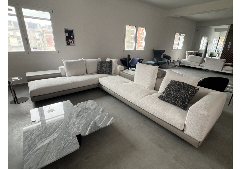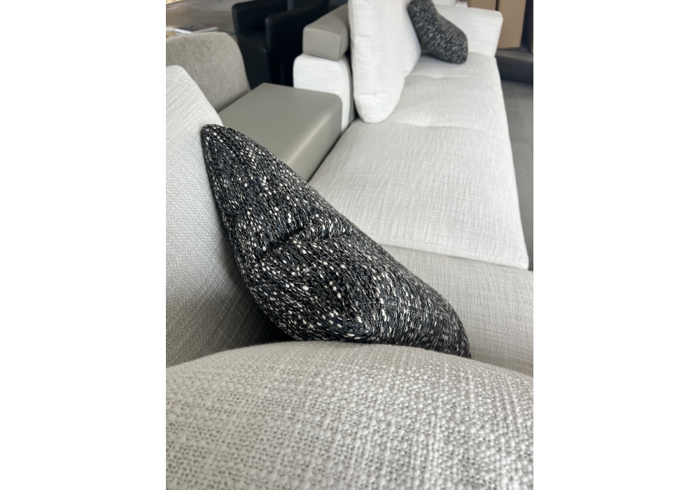 Connery designed by Rodolfo Dordoni for Minotti is a modular sofa with fabric upholstery and structure and elements in Aspen 06 pumice leather. Two Medley decorative cushions in 03 Fumo.