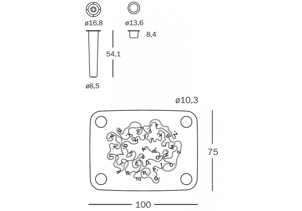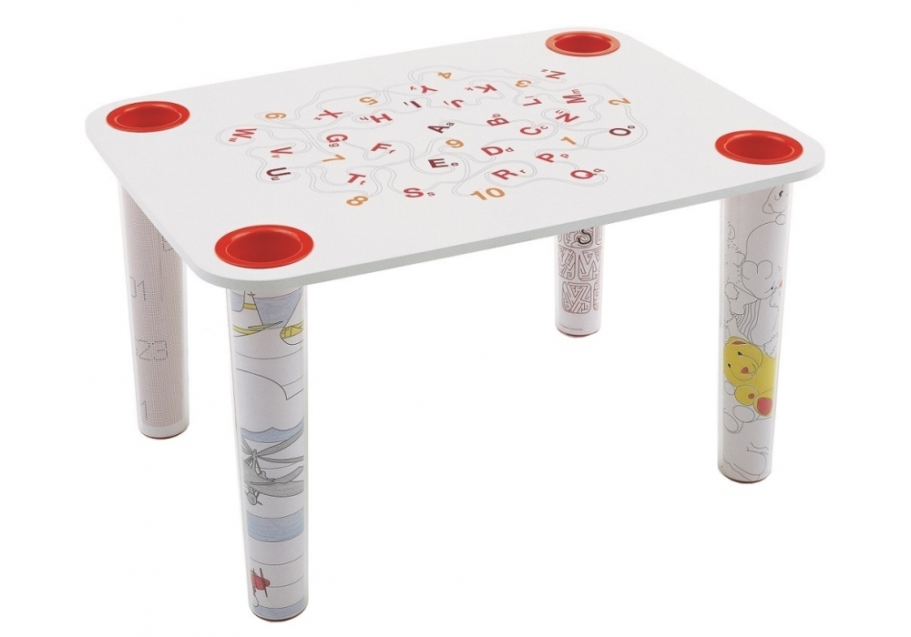 Little Flare Salad designed by Marcel Wanders for Magis Me Too is a table with transparent neutral polycarbonate legs, available with or without pen tray, MDF top covered with polymer leaf, perforated for housing the pen trays.