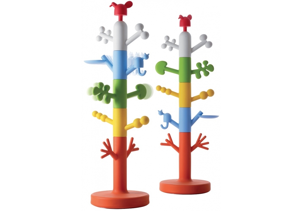 Paradise Tree designed by Oiva Toikka for Magis Me Too is a coat hanger made of polyethylene. Ballast and internal structure in cold-galvanized steel. The base and the first two elements at the top are fixed while the three intermediate ones are interchangeable.
