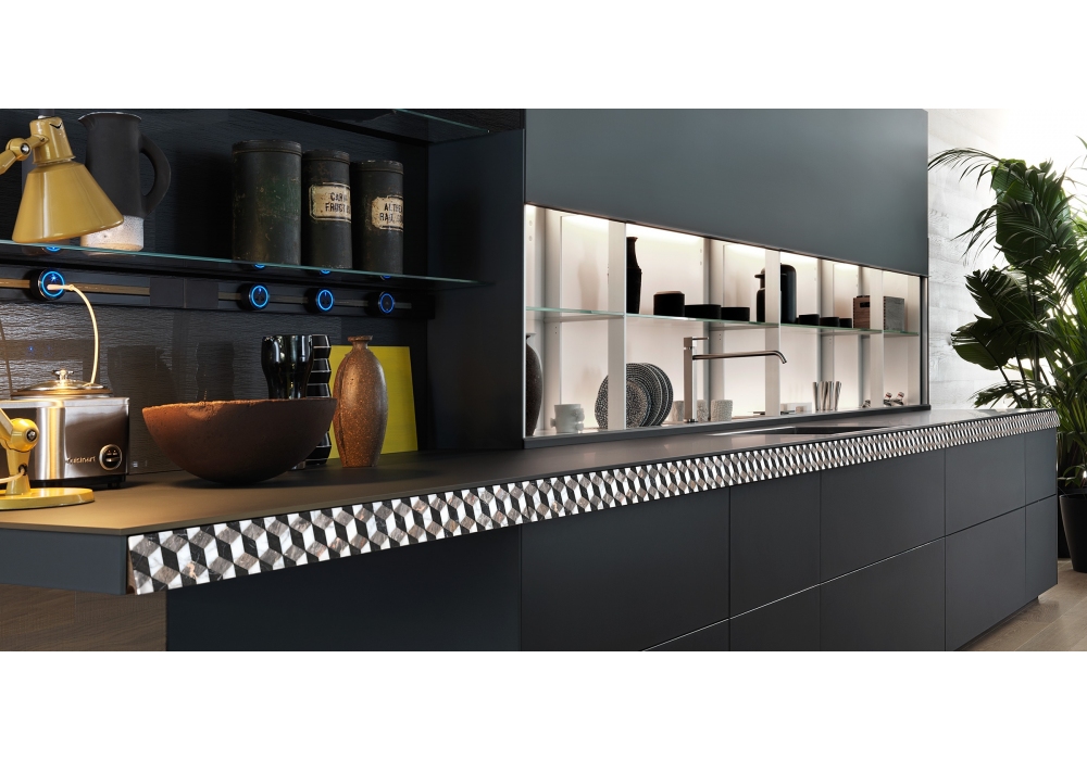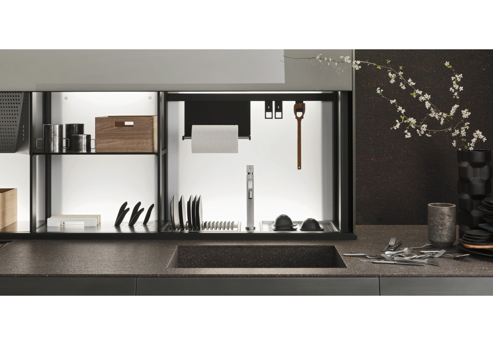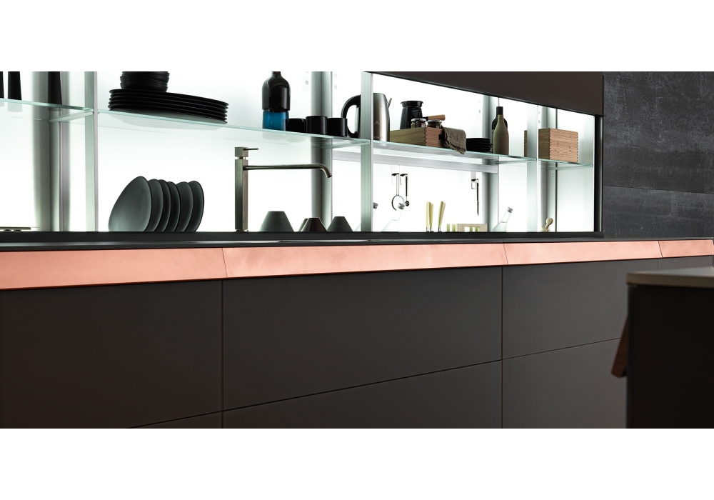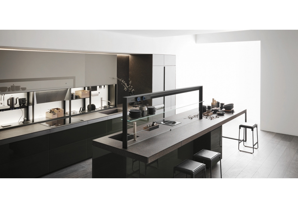 Genius Loci designed by Gabriele Centazzo for Valcucine is a customizable kitchen with different finishes and processes, for a sophisticated result and maximum research. The top can be made of glass, steel, carbontec, acrylic, stone or wood. Doors, wall units and columns can be, in laminate, with panel in Medium Density, wood, acrylic, steel and vitrum.