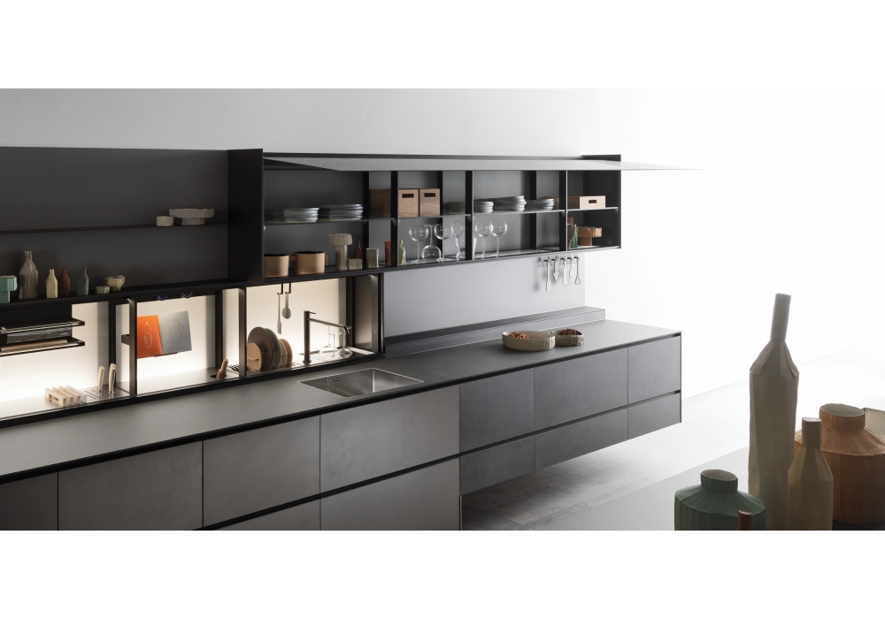 Riciclantica designed by Gabriele Centazzo for Valcucine is a kitchen with aluminum structure, modular and designed, even with suspended elements, giving maximum freedom of composition and movement. The top can be made of, water-repellent chipboard covered with a sheet steel, quartz, acrylic, stone, glass, stainless steel or carbontec. Doors, wall units and columns in laminate, aluminum or steel.