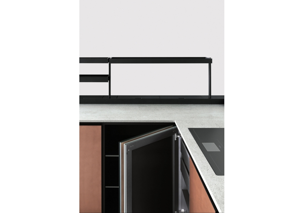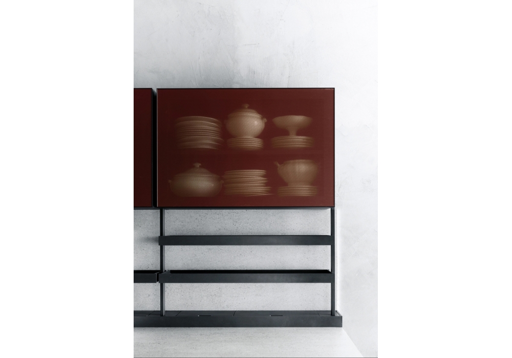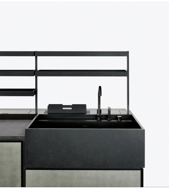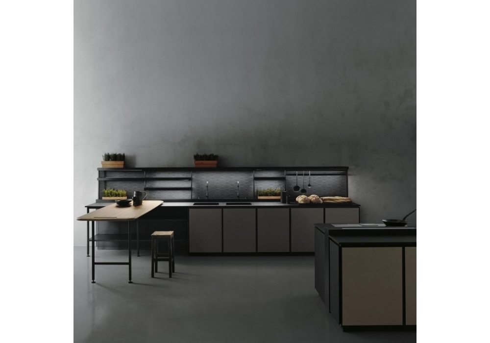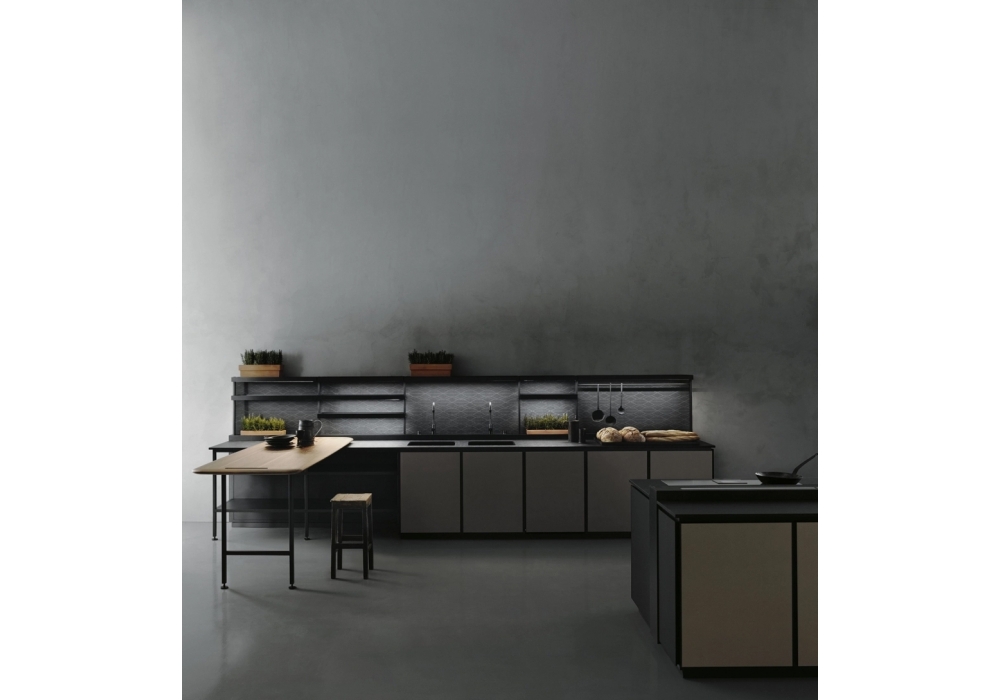 Salinas designed by Patricia Urquiola for Boffi is a kitchen with metal tubular structure, doors with aluminum frame and panels in different finishes and work surfaces in exclusive materials. Available in different compositions and materials.