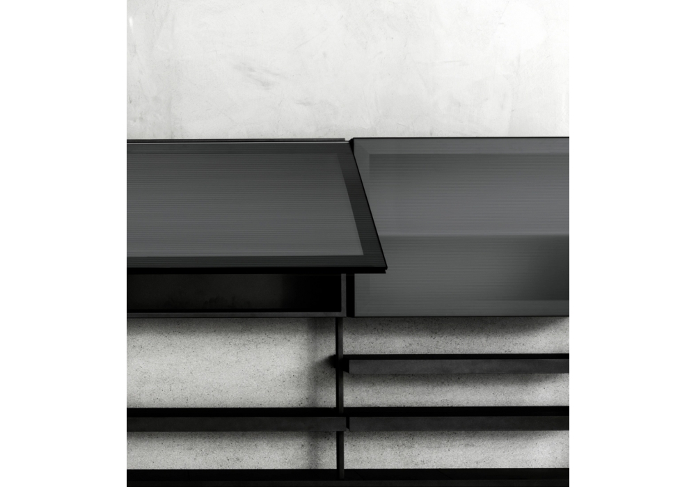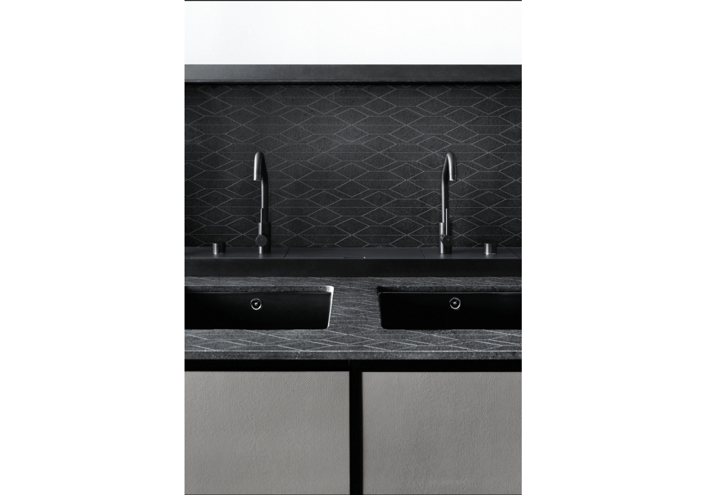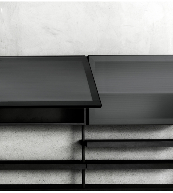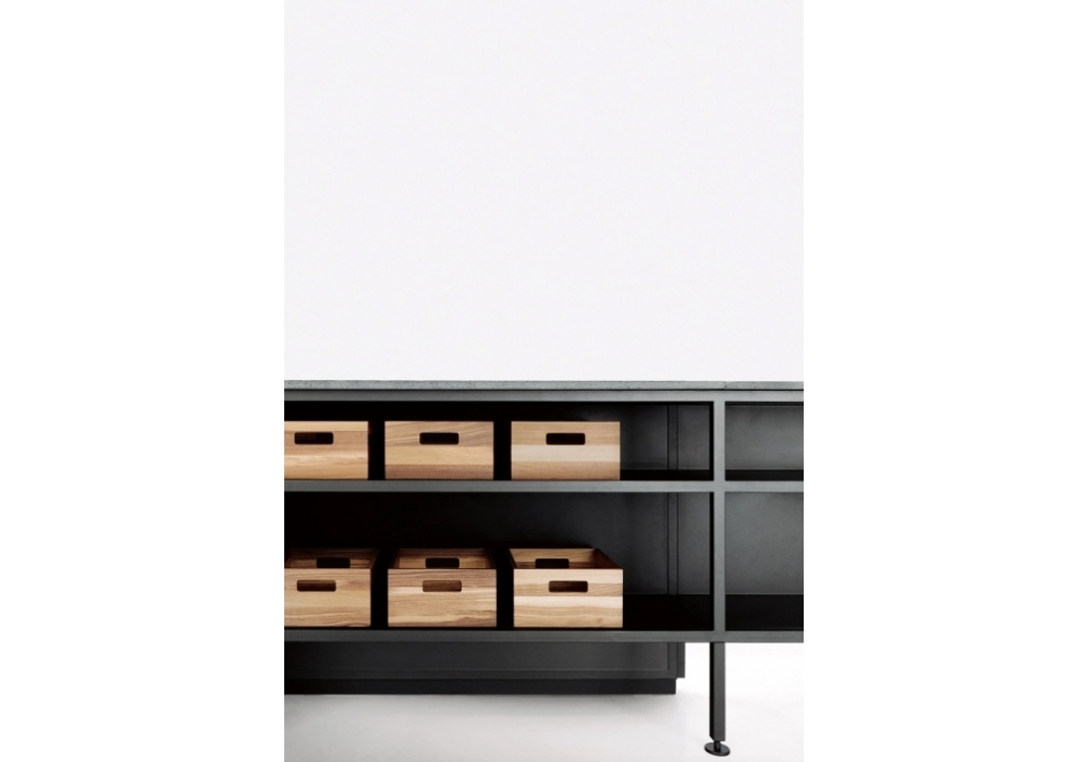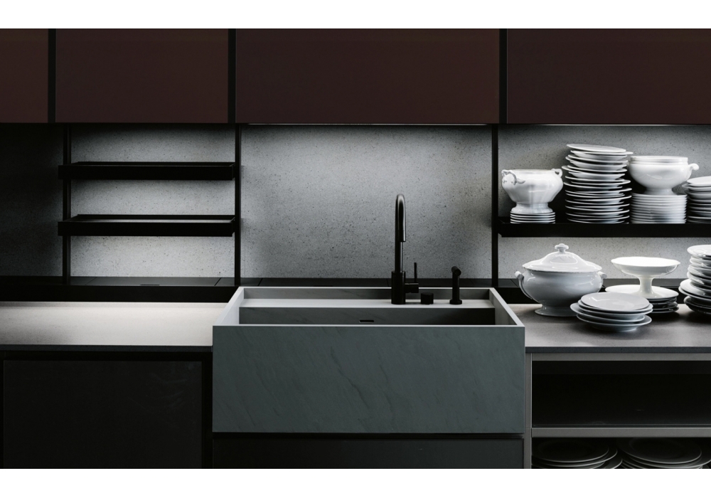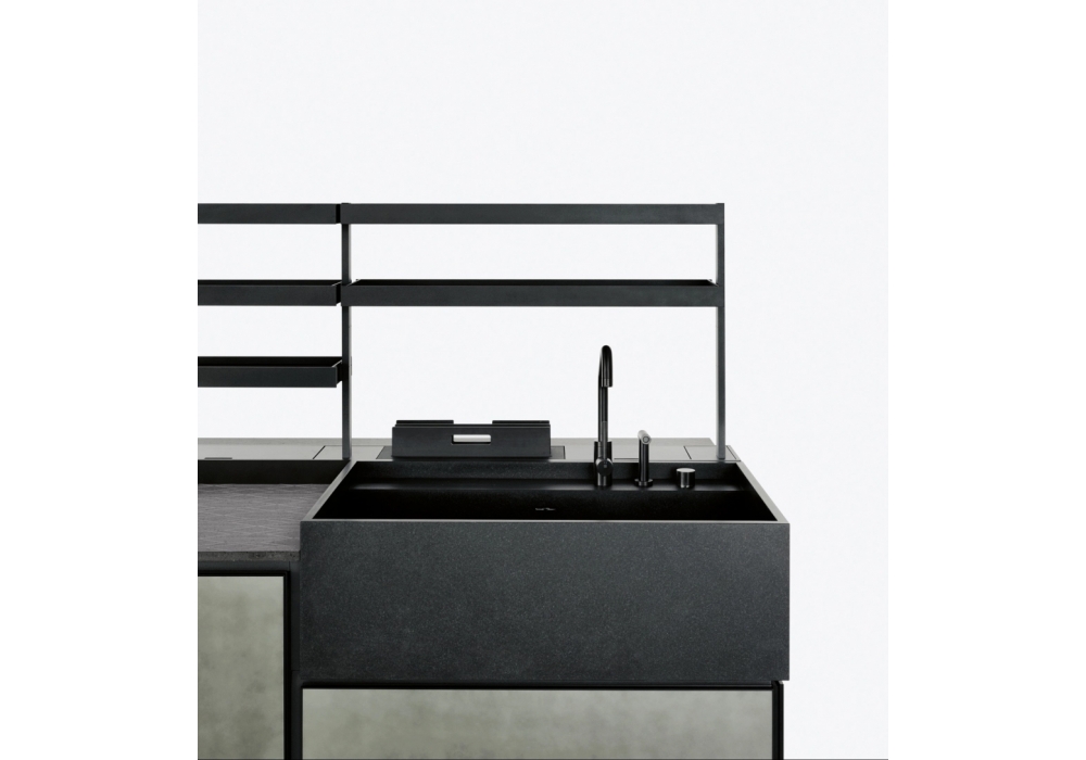 Salinas designed by Patricia Urquiola for Boffi is a kitchen with metal tubular structure, doors with aluminum frame and panels in different finishes and work surfaces in exclusive materials. Available in different compositions and materials.