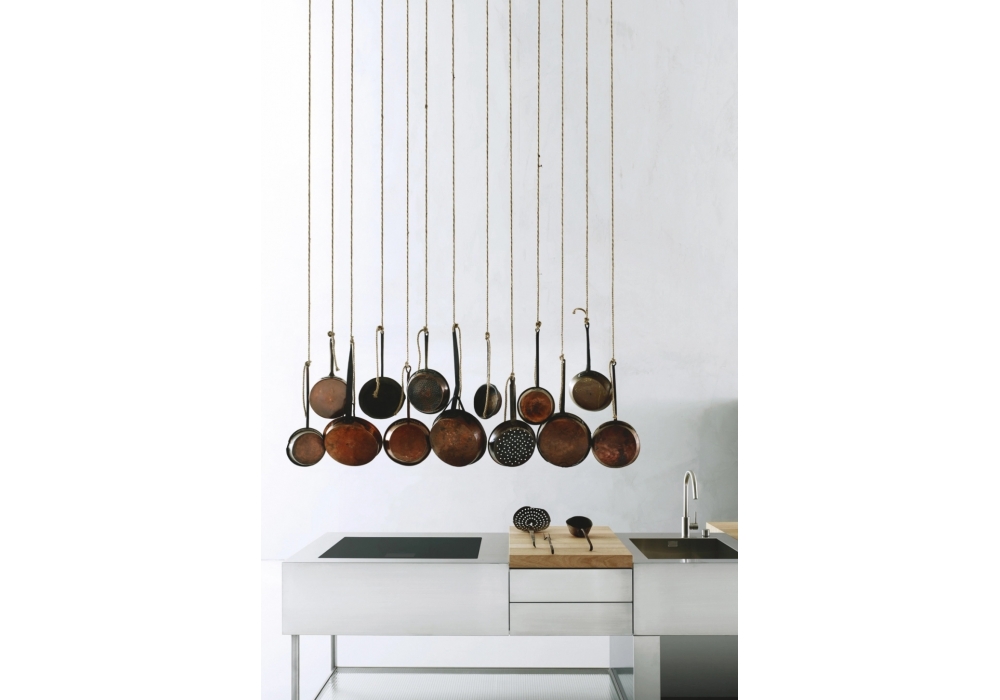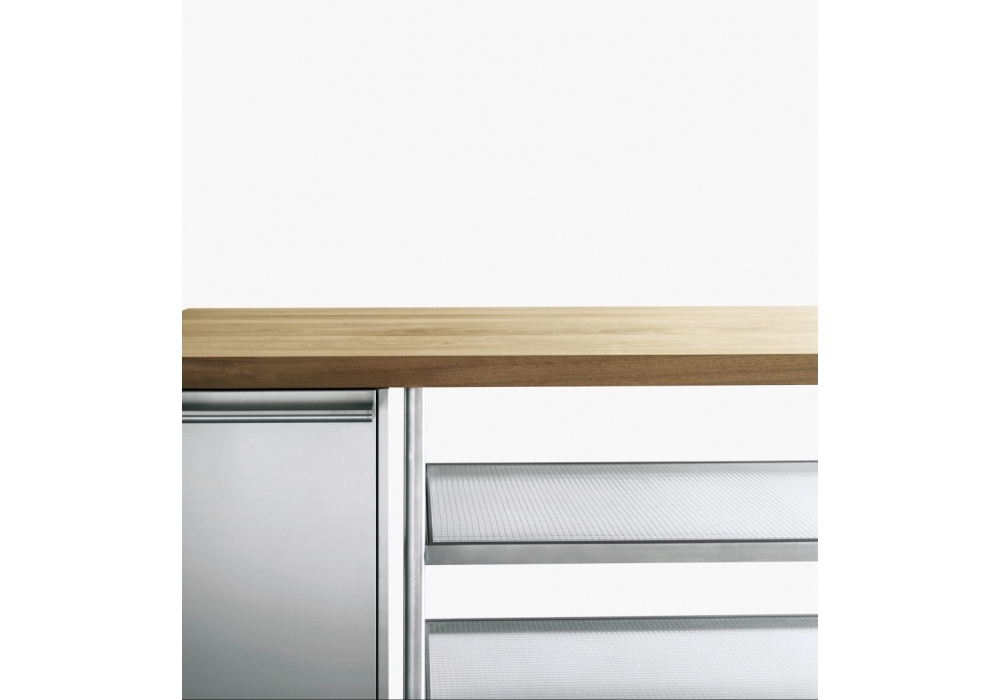 Open designed by Piero Lissoni for Boffi is a kitchen with supporting structure, cooking block and washing block in stainless steel. The bench table fitted with double shelves in wired glass and a stainless steel frame.