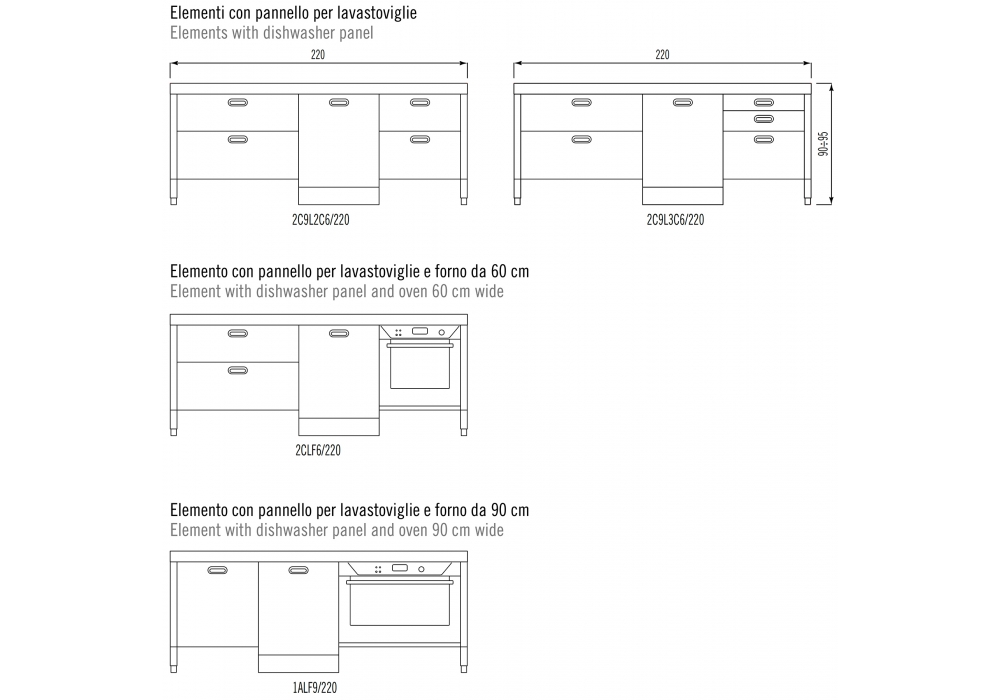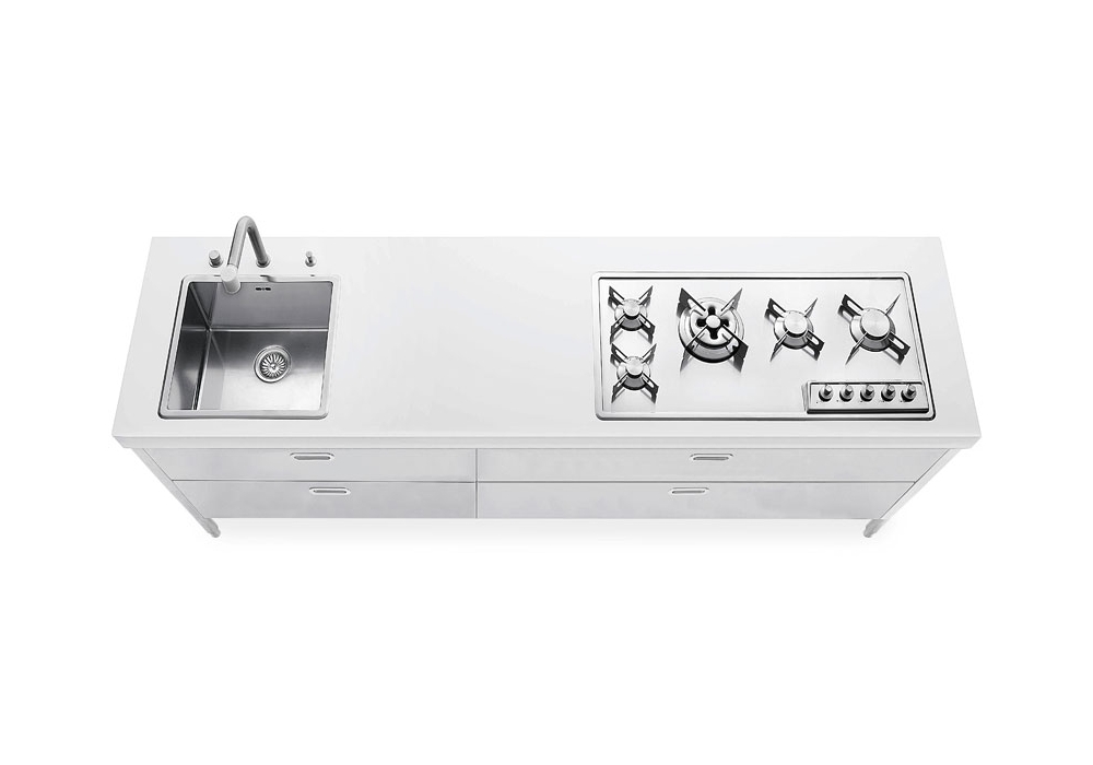 The Kitchen 220 by Alpes Inox, includes kitchen unit with sink, hob, storage, refrigerator and wine cooler.