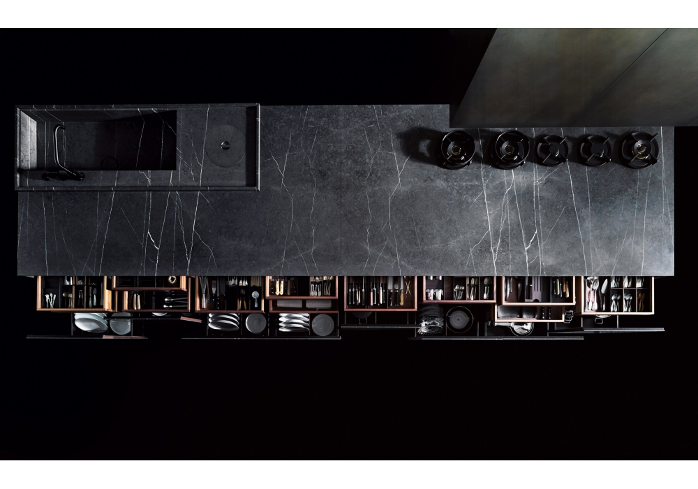 Code designed by Piero Lissoni, is a kitchen model in which highly customized materials, finishes and types of containers come into play. Wide choice of variants of wood, metal and stone finishes: woods of exclusive origin that are extracted from rivers with thousands of years of history, metals that are manually treated with special finishes, refined natural stones and unique finishes.