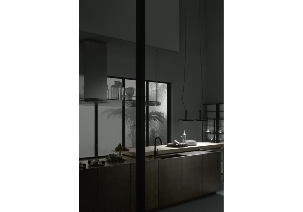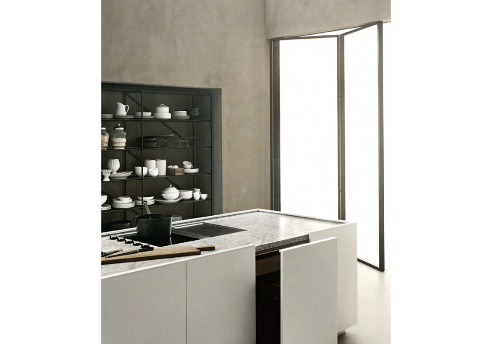 K21 designed by Norbert Wangen is a kitchen that stands out for its monolithic and extremely defined appearance, accentuated by the tub-like conformation of the worktops. In the presence of drawers and large drawers, the opening is guaranteed by an intermediate handle band in extruded aluminum.