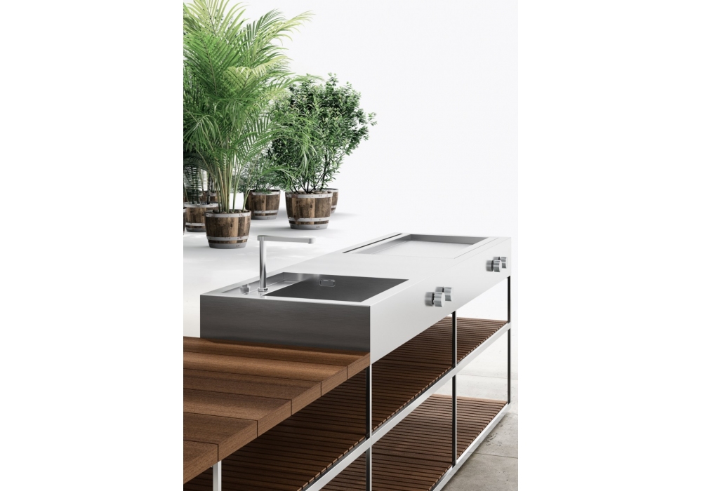 AH01Outdoor designed by Alessandro Andreucci & Christian Hoisl for Boffi is a kitchen composed of stainless steel blocks and specially designed for outdoor use, it is based on a tubular stainless steel structure and includes three separate modules - for cooking, washing and preparation. , in the wall or island versions - or monoblocs that contain all the three functions, also wall or island.