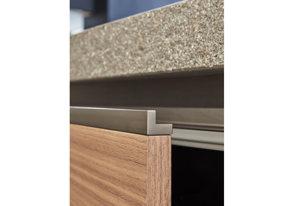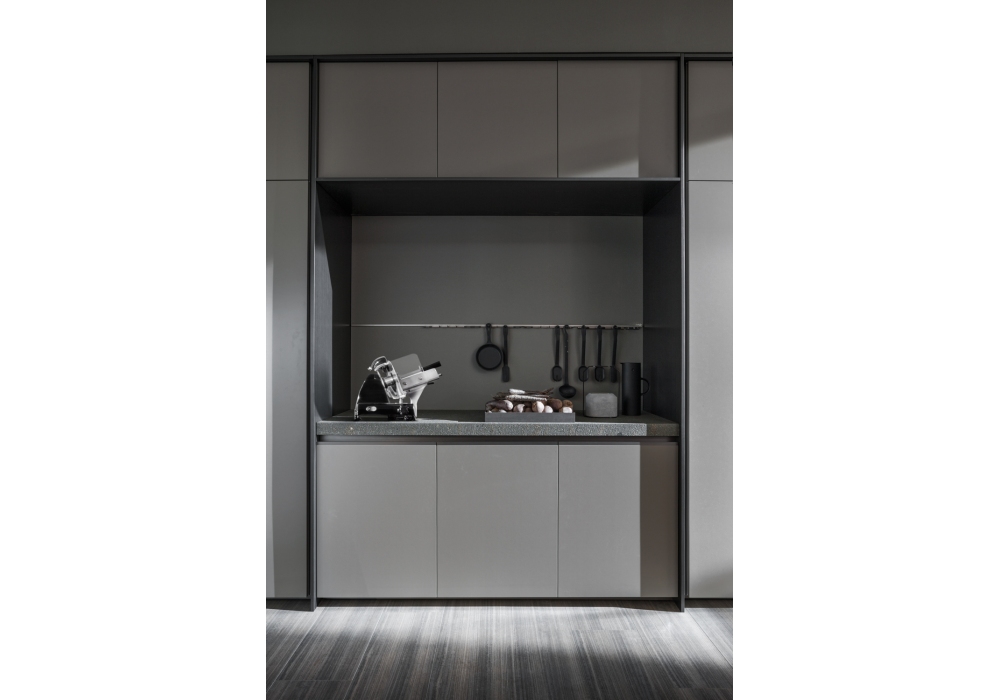 VVD designed by Vincent Van Duysen for Molteni&C is a kitchen without handle, which is based on the contrast between the thicknesses of the sides and terminals and the strong thicknesses of the worktops, which integrate, interrupting the linearity of the top, with stone. The project is completed by large extractable trays, open drawers and trolleys that can be integrated into the undermounts. The innovation is expressed with technological details such as the integrated LED bar, the aluminum profile that discreetly designs the door handle, improving its grip and the innovative pivot hinge that allows the doors to open at 180 °, making the interior space is more usable.
