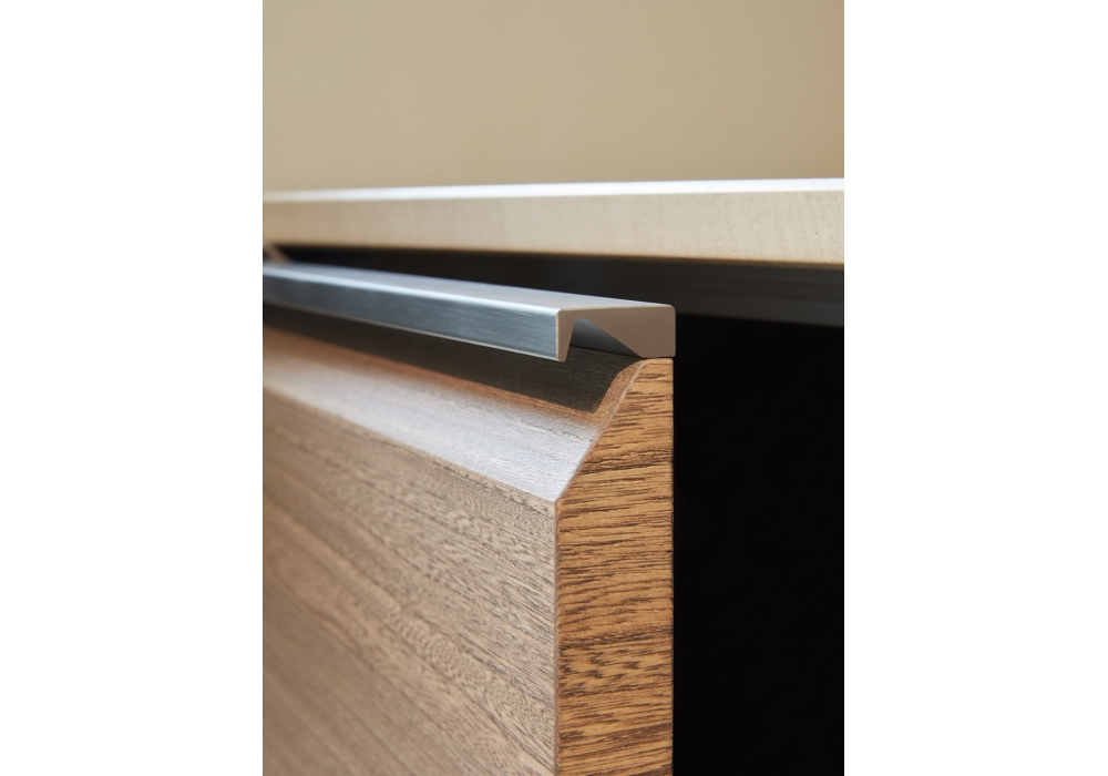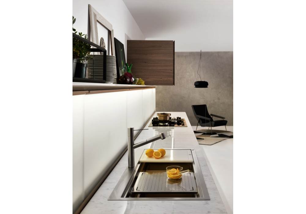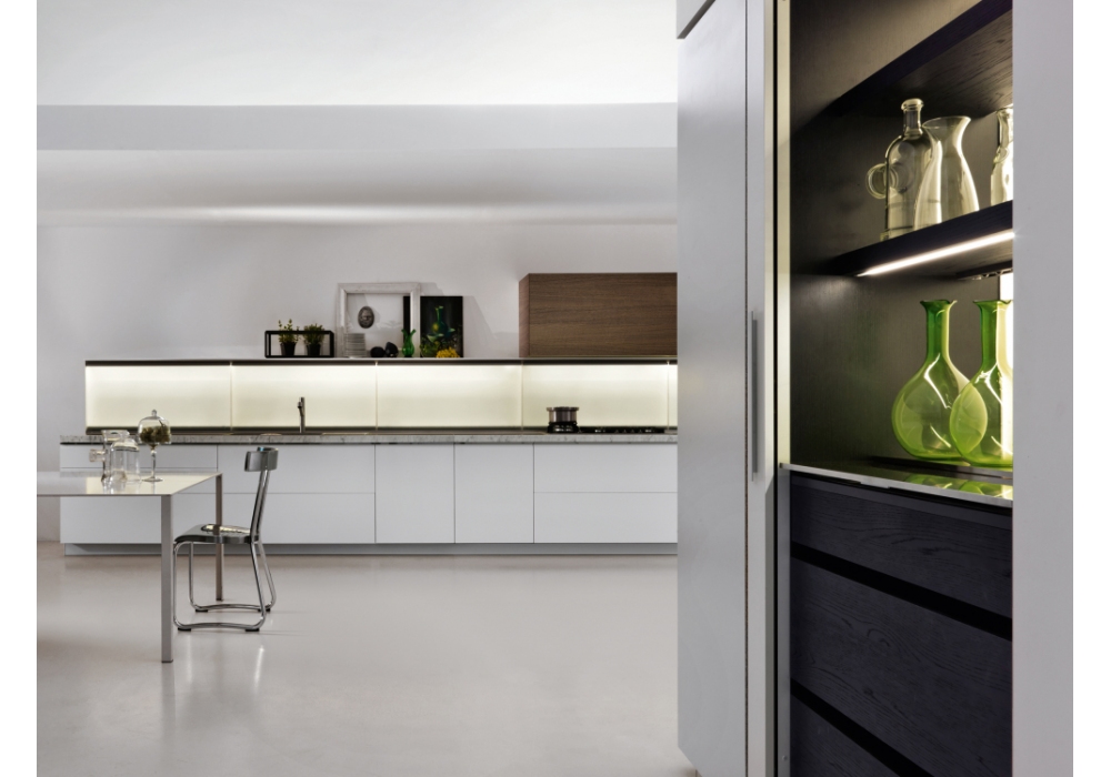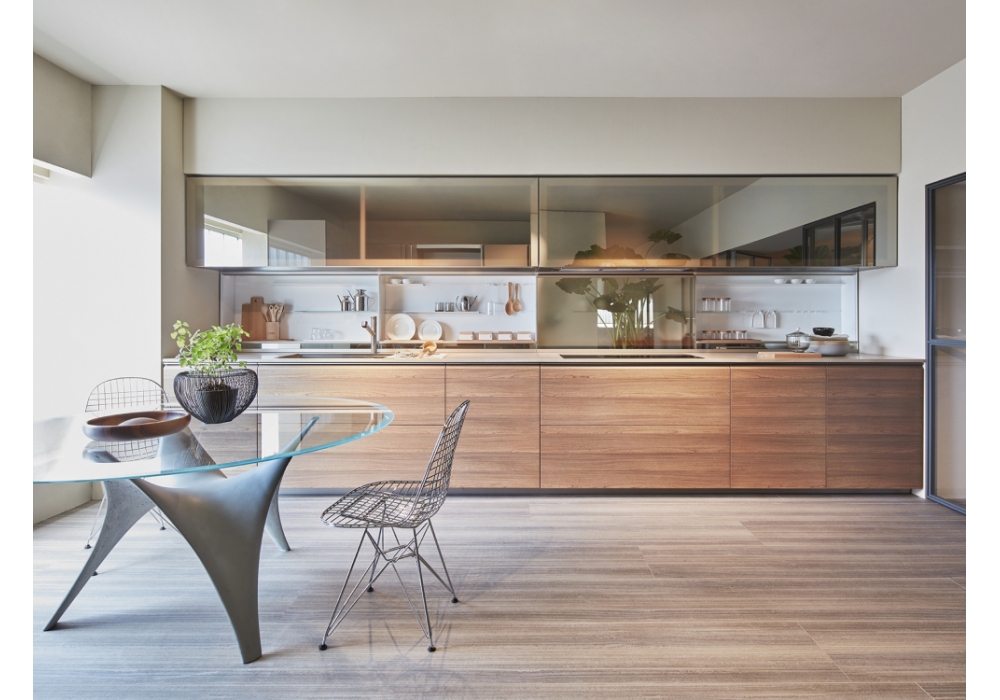 Trim designed by Dante Bonuccelli for Molteni&C is a revolutionary kitchen. Drawers, doors and wall units are no longer enough. The equipped backrests arrive. Positioned in the center of the composition, between base and wall units, they enrich the system with functional and operational benefits. The backrest uses an exclusive patented Dada mechanism that balances and adjusts the sliding of the panel, with the glass disappearing inside the bases. The patent also provides for the possibility of breaking down the glass for optimal maintenance and cleaning operations. The LED lights and power sockets contribute to making the equipped backrest the technological soul of Trim.