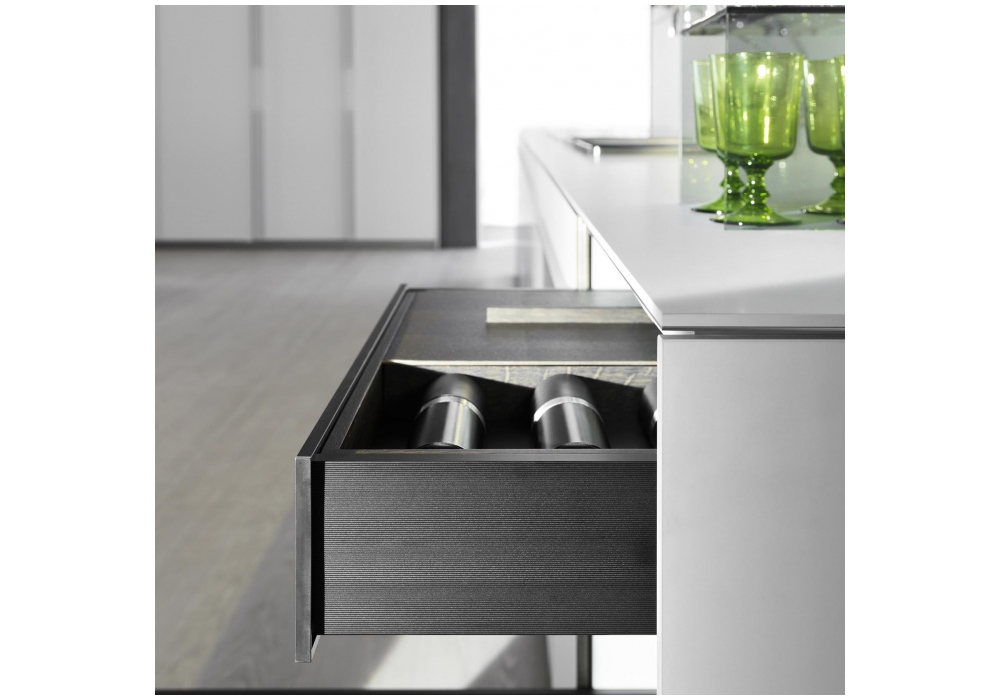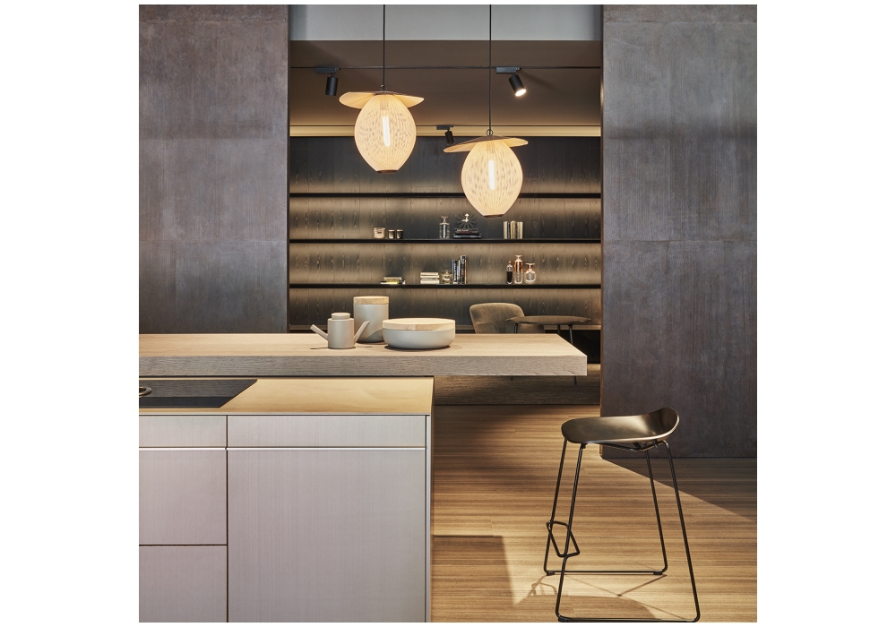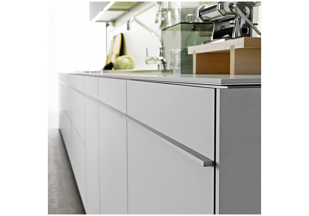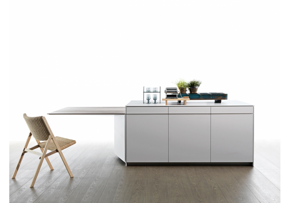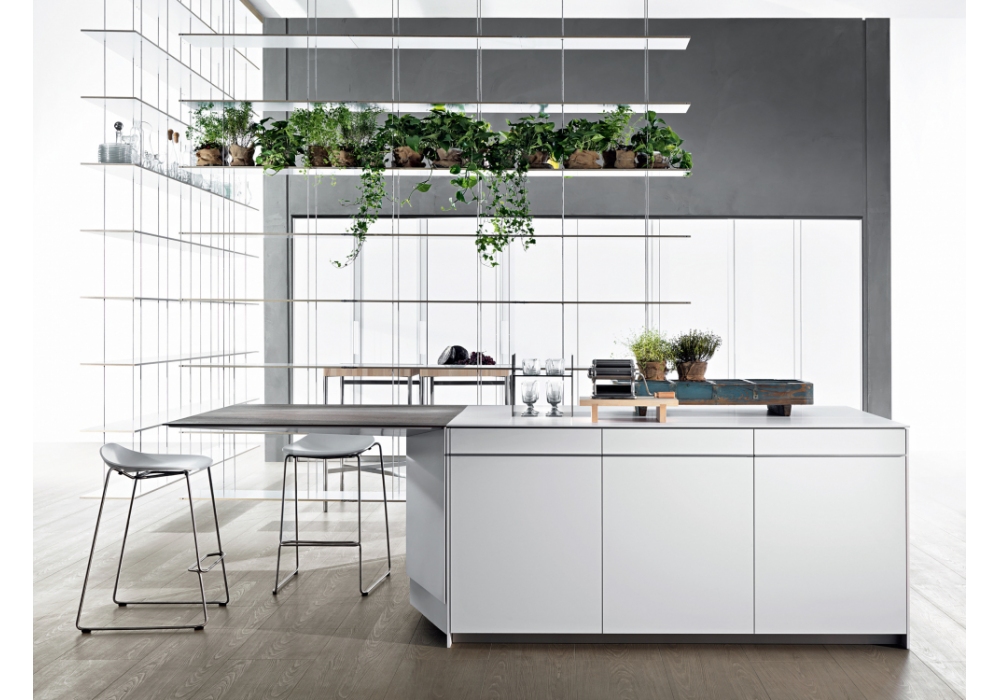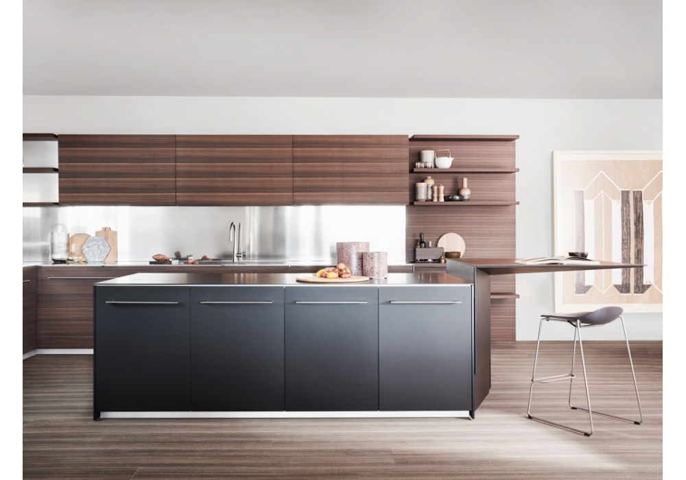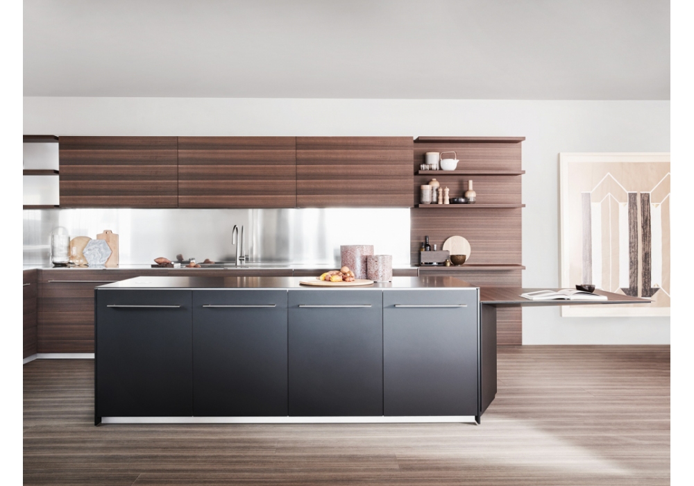 Vela designed by Dante Bonuccelli for Molteni&C is a kitchen with a classic design. The construction technique evolves and stratifies different materials, compensating for tensions and designing new proportions and distinctive technical details, such as the new hinged opening mechanism that allows a particular rotation of the door. Overlapping of fine lines characterize the tops, which hide the processing technology.