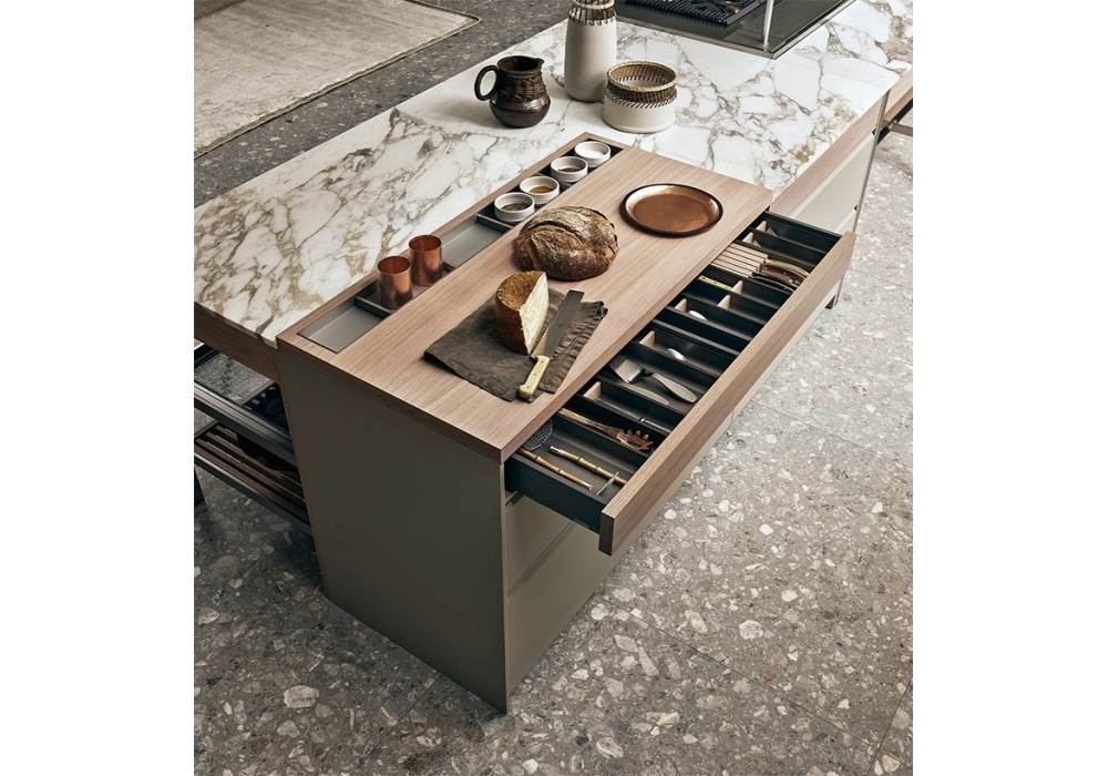 K-lab 01 designed by Ernestomeda is a kitchen with an innovative design, in which tradition coexists harmoniously with experimentation and "cult" elements are mixed with contemporary lines, technological materials and original use solutions. The elements that distinguish K-Lab are countless: the Showcase, suspended on the wall and on the ground; the Cook chopping board with recess for the storage accessories; the Surf System, characterized by modular internal equipment.