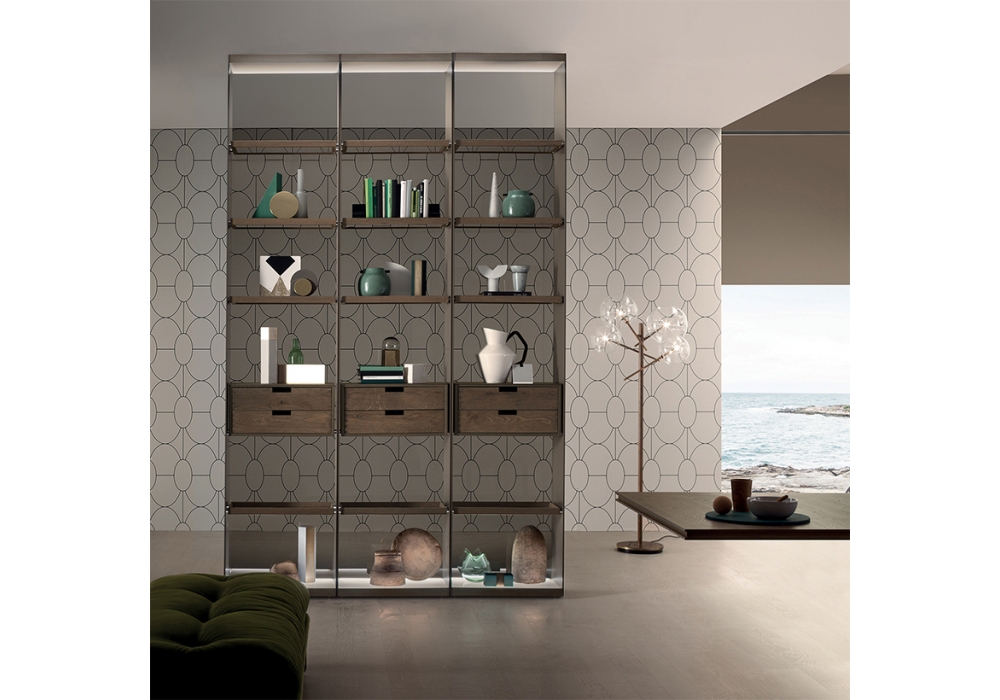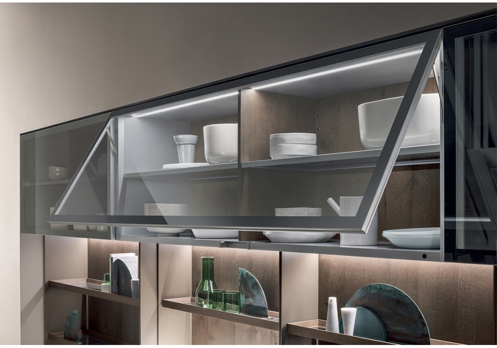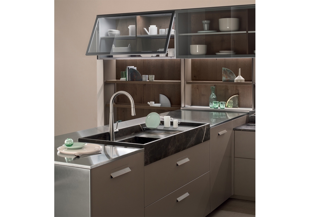 Soul 02 designed by Ernestomeda is a kitchen available in a vast choice of materials and finishes making each project unique. The fusion between kitchen and living is made fluid thanks to modular elements such as the Medley shelving system which can be used in multiple configurations.