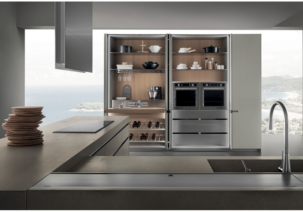 Icon 02 designed by Ernestomeda is a kitchen with an Evolution peninsula that can be used as a snack area in the closed version and a dining table in the open version, Union worktop with integrated basin, "Set" living area made up of boiseries that can be equipped with shelves and suspended units of various dimensions.