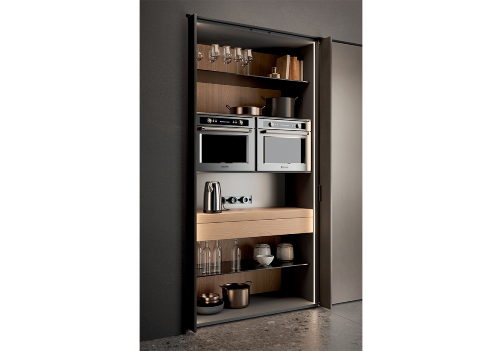 One 03 designed by Ernestomeda is a kitchen made up of wall units, shelves and a peninsula that expands the space and makes the kitchen and living areas communicating: every furnishing detail of this kitchen enhances the material value of the surfaces while offering maximum practicality .