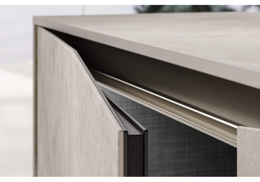Elementi designed by Snaidero is a kitchen with a minimalist style, the result of research and development, oriented towards the natural essentiality of the forms represented by the 4 main materials of the project: stone (ceramic), glass, aluminum and wood. The design created on the profile of the door is handcrafted on the gray cast iron aluminum frame with a milled ribbed edge that enhances the quality and technical nature of the material.