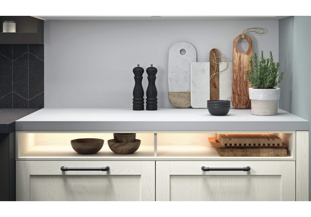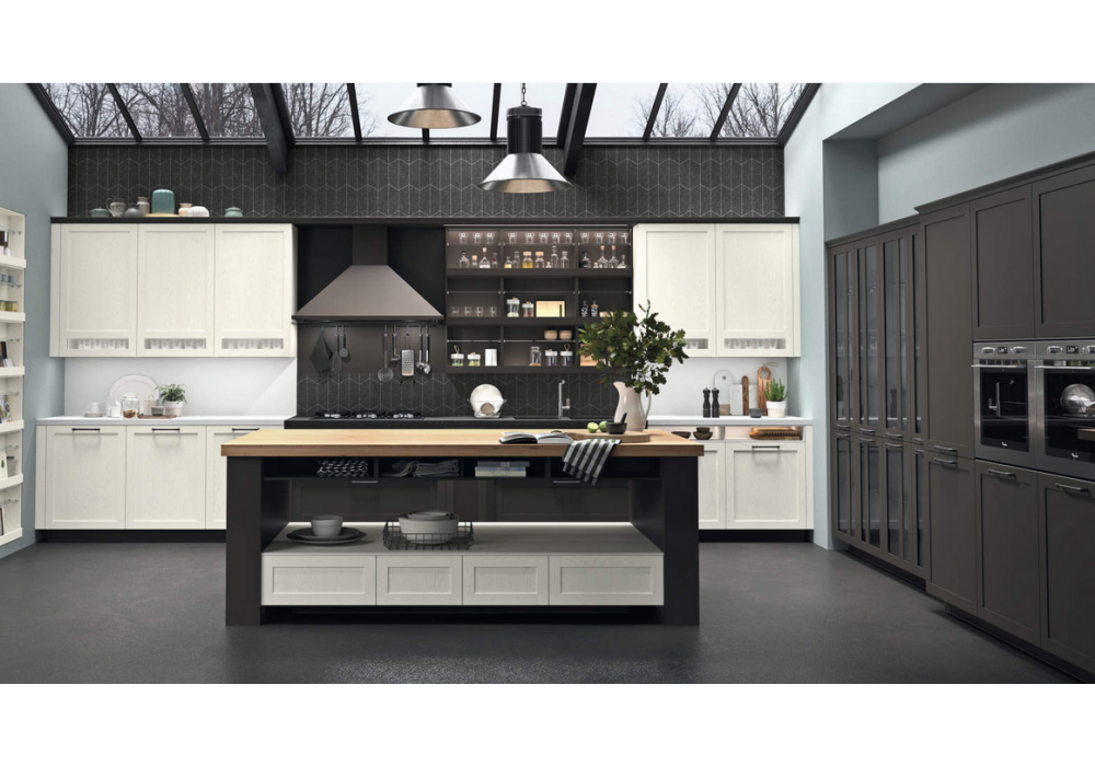 Hera designed by Michele Marcon for Snaidero is a country-style kitchen that gives its best in large and spacious environments, where it is possible to include all those modules that contribute most to identifying the style: the open compartments, in particular, represent a important for designing functional and visible containment spaces.