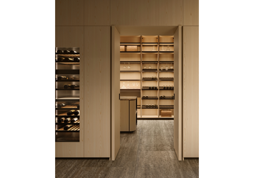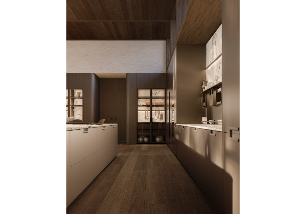 Physis designed by Vincent Van Duysen for Molteni&C is a kitchen with a contemporary, organic design, featuring soft lines and rounded corners that create a welcoming, fluid aesthetic. The curved worktop with metal details enhances the material continuity, while integrated handles and harmonious volumes define a clean, elegant aesthetic. Glass elements and open compartments add lightness, complemented by integrated LED lighting. A modular and versatile system, designed to adapt to different spaces with a refined, timeless style.