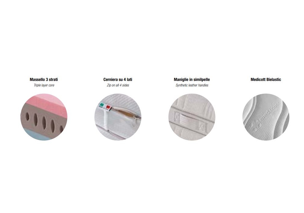 Suprema Feel designed and produced by Twils is a mattress with 3-layer solid wood, 7 Aquatech zones and a Feel surface. Removable external lining in Medicott Bielastic Silver fabric. Zipper on 4 sides and faux leather handles. Available in different sizes. 23cm tall.