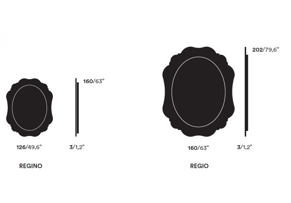 Regio e Regino designed by Paola Navone for Opinion Ciatti is a shaped mirror with frontal engraving. Can be positioned vertically or horizontally. Available in 2 dimensions.