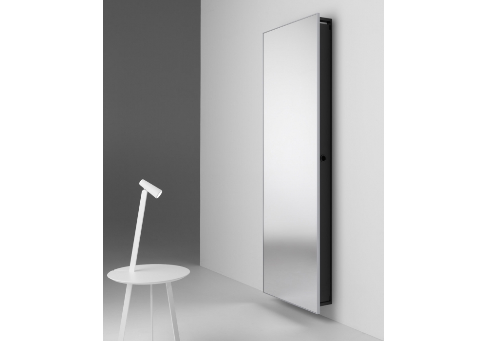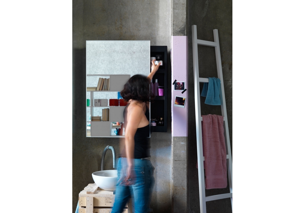 Backstage designed by Salvatore Indriolo for Casamania & Horm is a mirror cabinet with lacquered sheet-iron structure and shelves. Mirror with non-machined edge, 4 mm thick, protected by self-adhesive polyethylene safety film. In the event of breakage, dangerous shards of glass do not come loose. Frame made from extruded anodized aluminium.
