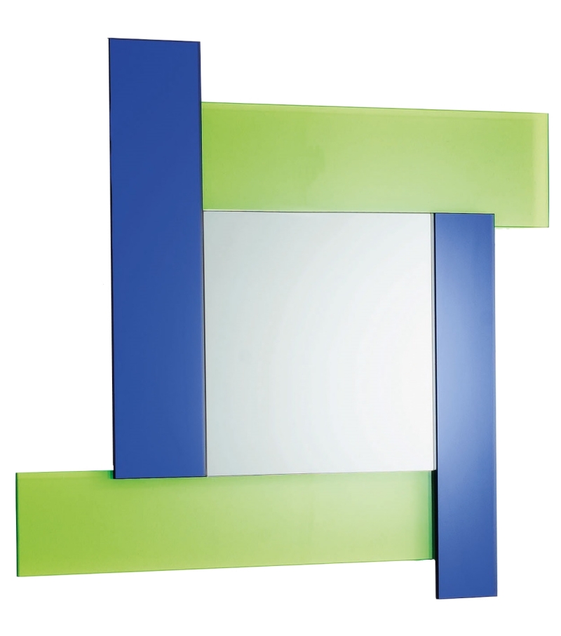 Dioniso 2 designed by Ettore Sottass for Glas Italia is a mirror belonging to a collection of 6 wall mirrors of various shapes and sizes. It is characterized by polychrome frames composed of elements in colored laminated mirror, colored laminated glass and lacquered glass.