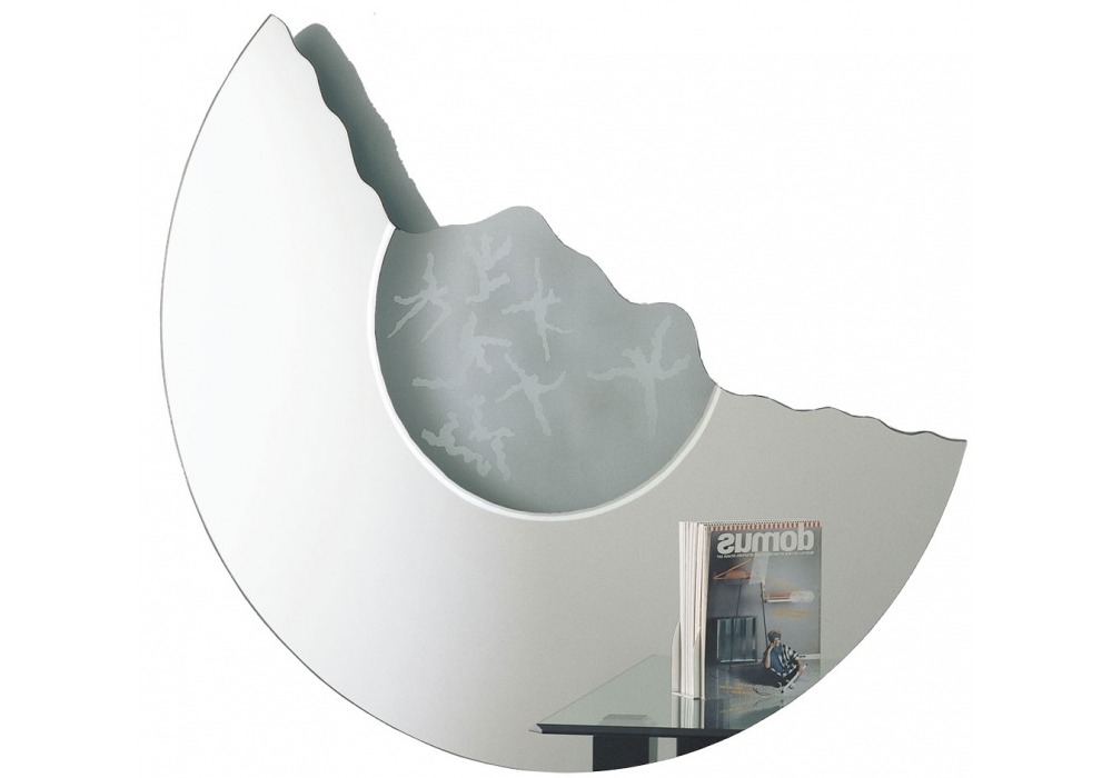Scornice 06 designed by Nanda Vigo for Glas Italia is a mirror with frame motif and satin decoration on the transparent surface, which repeats the reflections of the glass. A bevel engraved in the mirror emphasizes the trend of the frame.