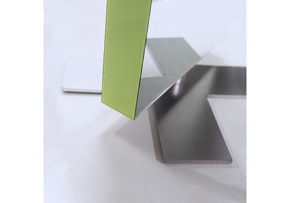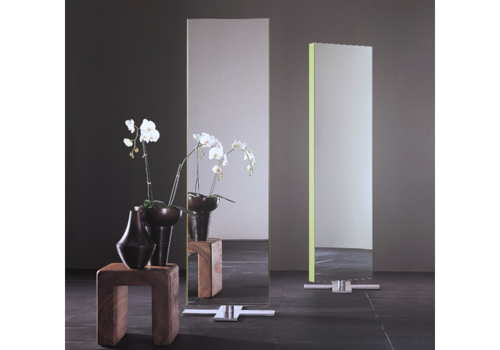 Giano by Opera Design is a double-sided and rotating floor mirror. It is made by gluing mirror sheets with bands of glossy lacquered crystal in various finishes. The base is in metal with a matt stainless steel finish.