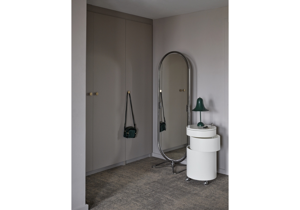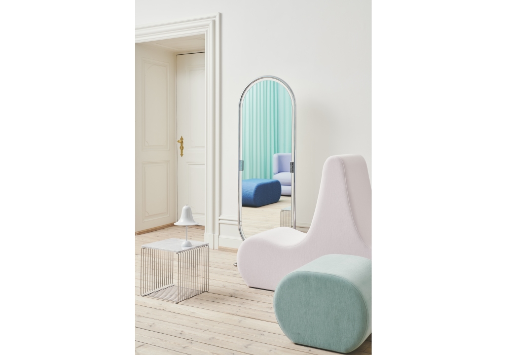 System 1-2-3 designed by Verner Panton for Verpan is a mirror mounted on an oval chromed steel structure with a 4 mm double-sided mirror. Butterfly-shaped chromed steel base. It tilts and turns 360°.