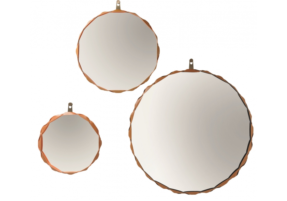 471 Raperonzolo designed by Atelier Oï for Zanotta is a mirror with outline made of cowhide in the shade of gold, interwoven with Alcantara® in the shades gold, blue and violet. Wall fastening by means of a bronzed metal plate.