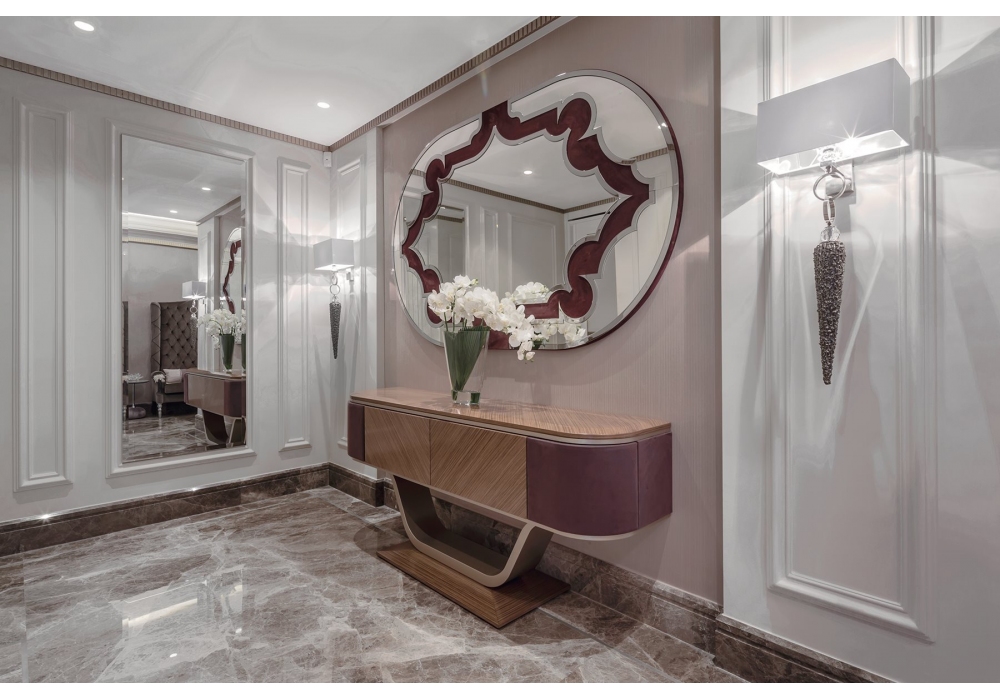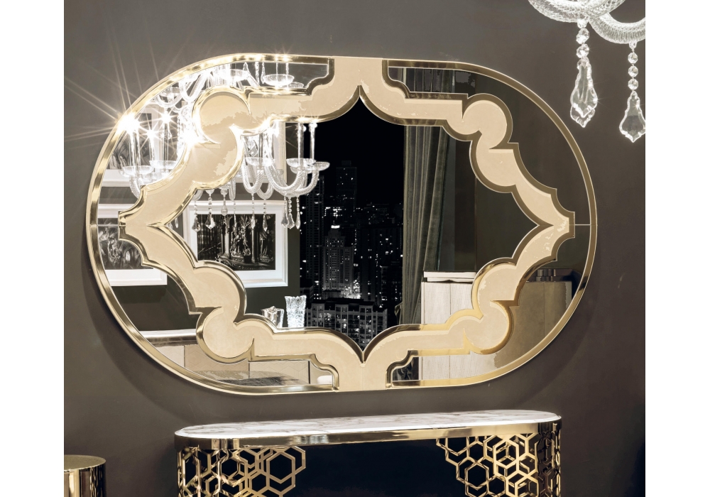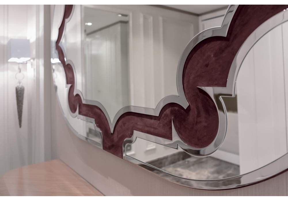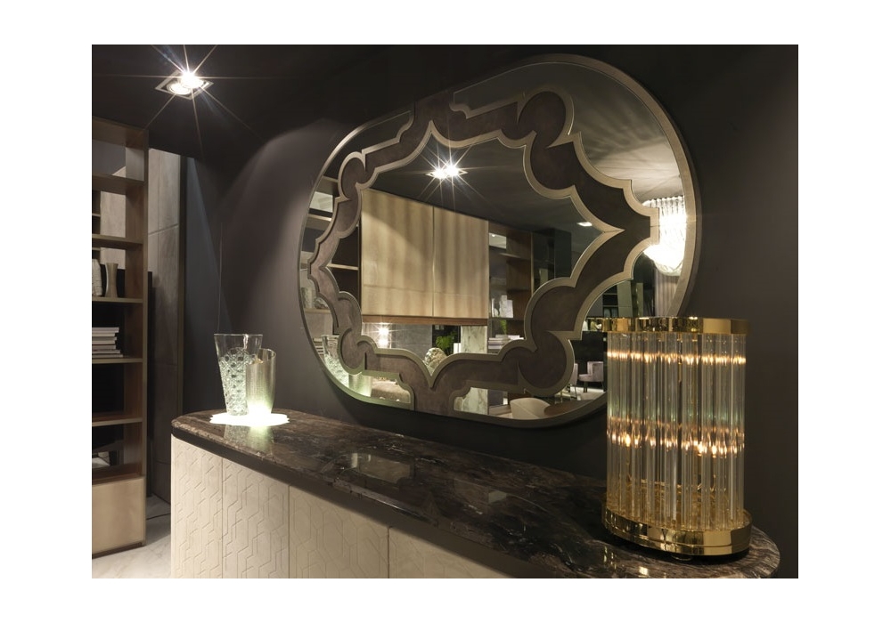 Byron designed by Giuseppe Iasparra for Longhi is a mirror with structure in glossy or matt ground metal and internal edge and decoration upholstered in chamois cat. suede. Available in different finishes.