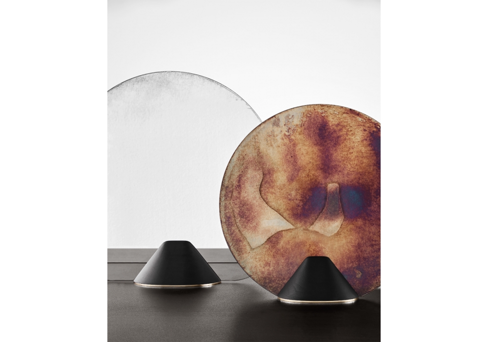 Flabello designed by Lanzavecchia & Wai for Gallotti&Radice is a 4mm hand silver-plated and antiqued table mirror. Black open pore lacquered ash wooden base and bright brass.