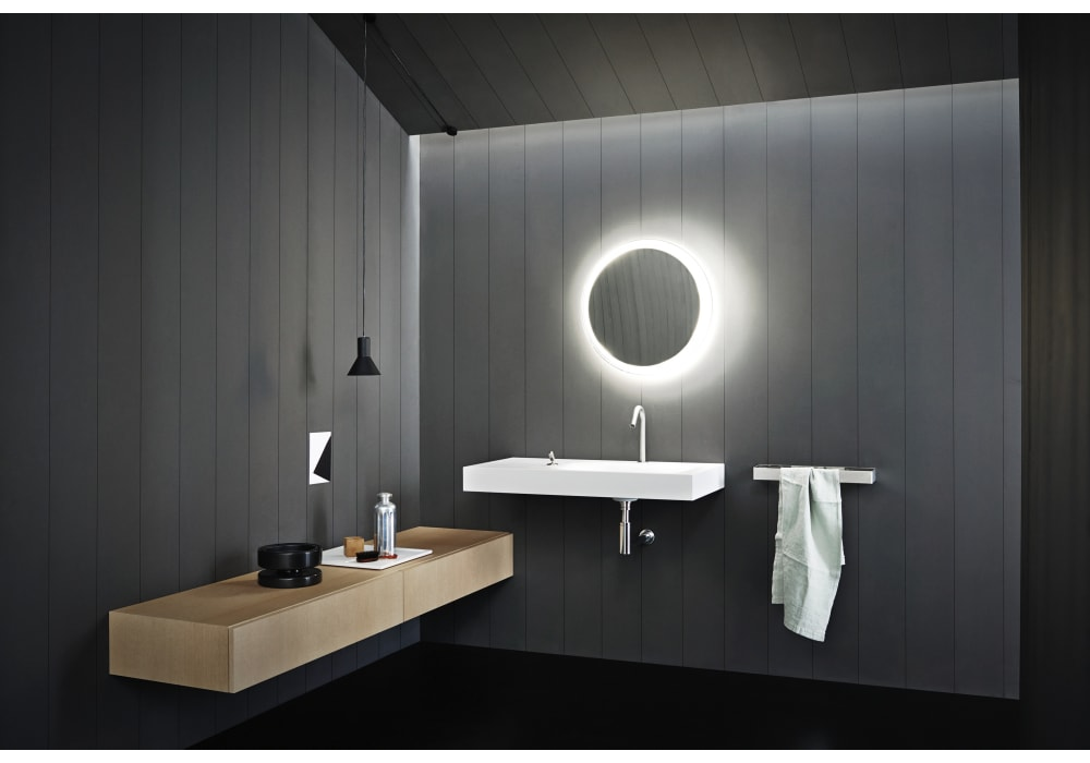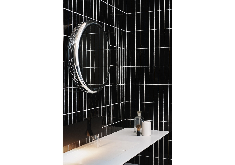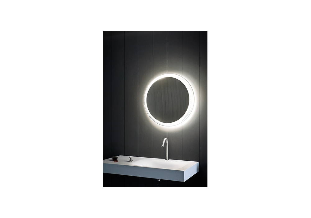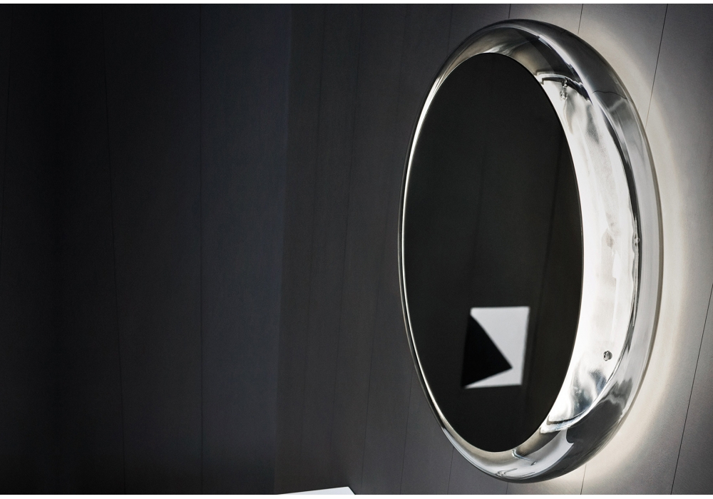 Solid designed by Diego Vencato & Marco Merendi for Agape is a round mirror with frame in metallic blown glass treated with metal coating which makes the surface reflecting and permeable to light. Lighting is built into the frame of the mirror. The blowing technique was created by hand, therefore any bubbles or impurities on the surface should be considered particular detail on the item.