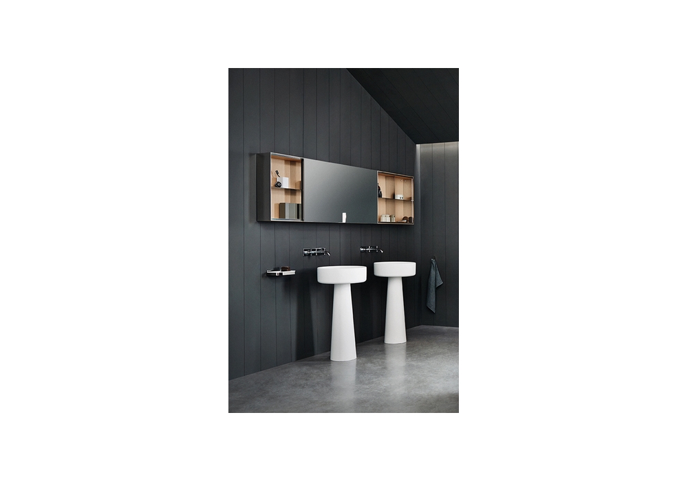027 designed by Benedini Associati for Agape is a wall-mounted mirror cabinet made of birch plywood with oak finish or reconstituted wood with teak finish. The dividing elements and the handle are in polished or satin stainless steel. The 3 mm thick mirror door is protected by a safety film.