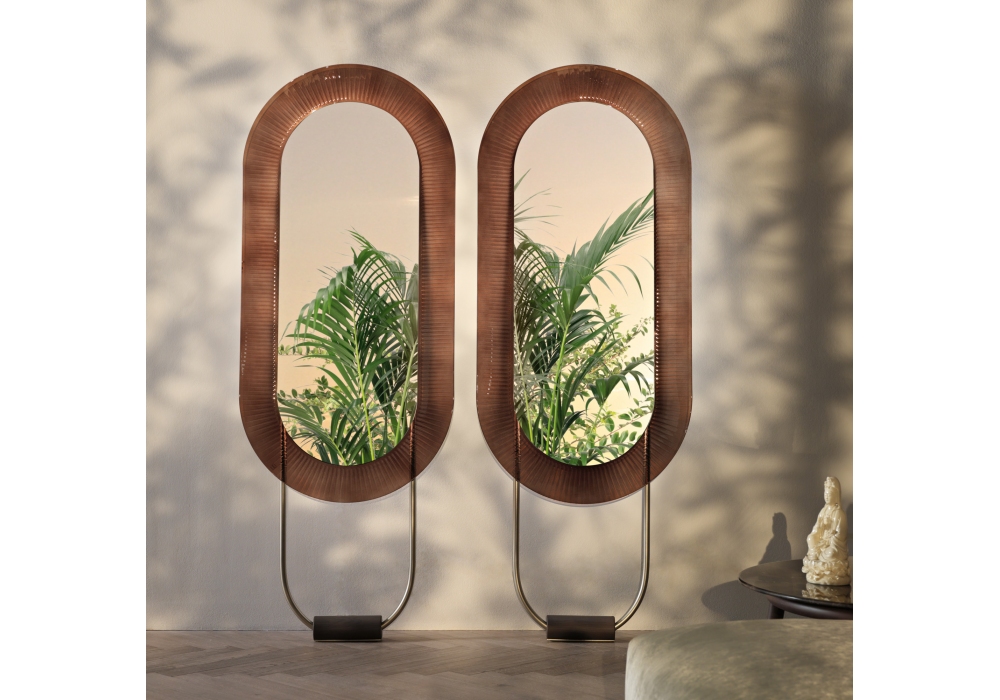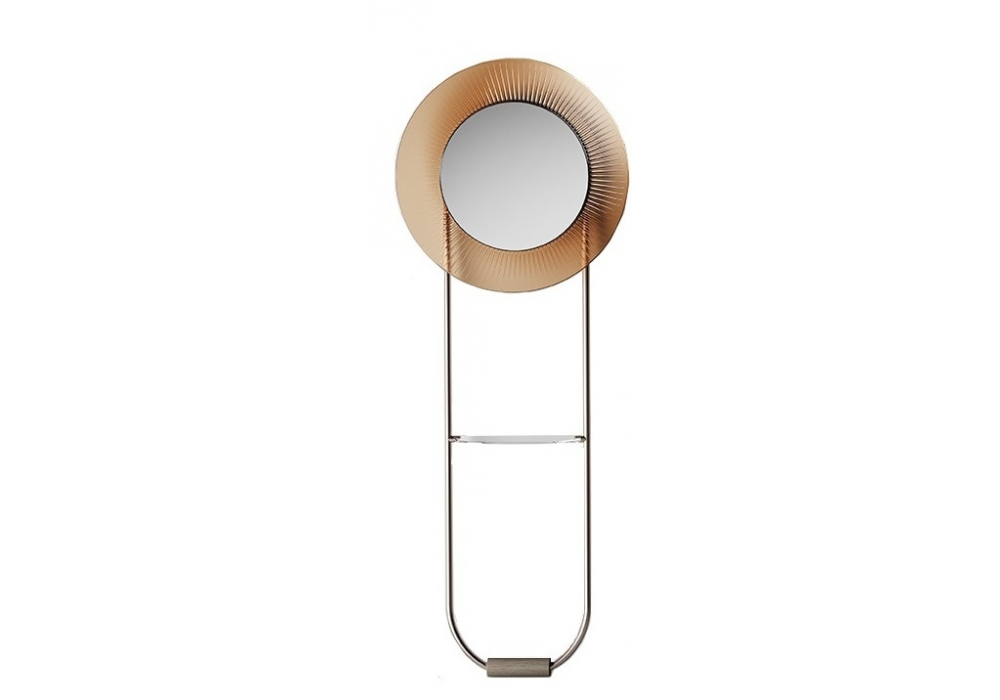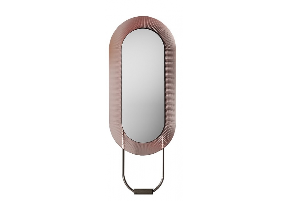 Kathleen designed by Davide Oppizzi for Fiam is an LED floor mirror with a frame in high-temperature fused glass, back-painted with semi-transparent colours. The structure is in metal in a metallic Champagne or volcano gray finish, with a solid wood foot on the ground. LED lighting system integrated into the structure, dimmable and with temperature regulation.