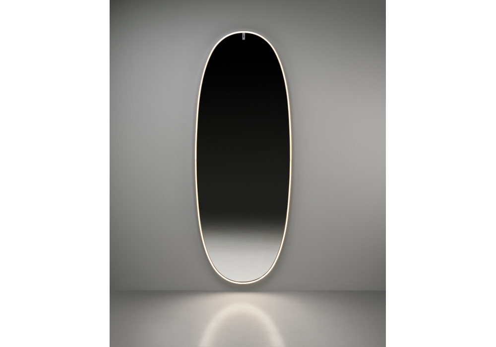 La Plus Belle designed by Philippe Starck for Flos is an elliptical wall mirror with an aluminum structure available in different finishes. Dimmer and LED light source included.