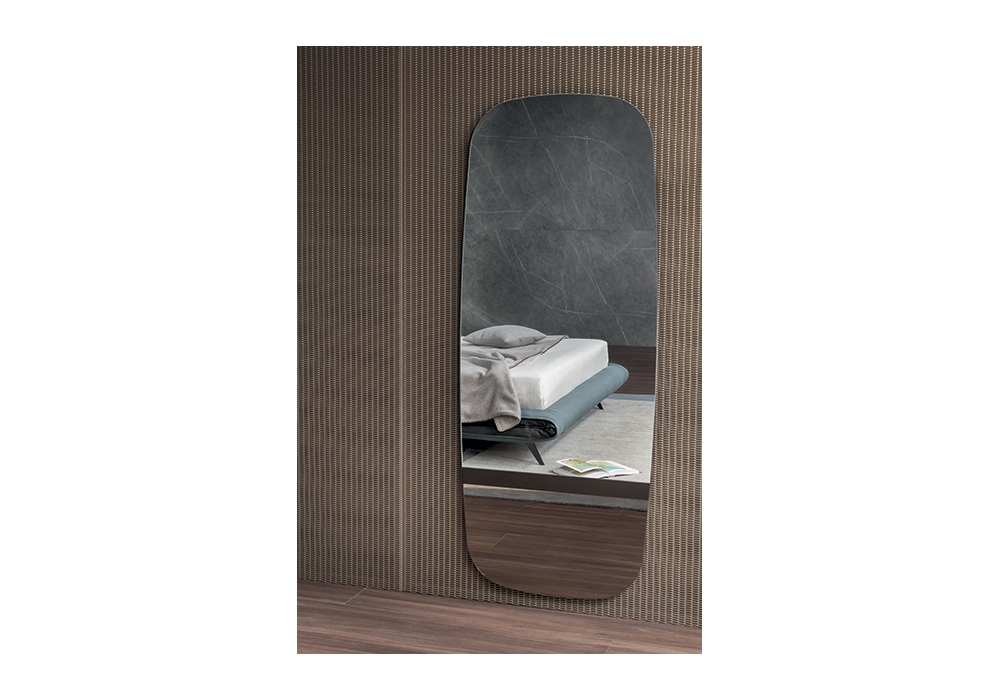 Lake designed by Gino Carollo for Bonaldo is a mirror available in various sizes. The upper band is a mirror, the central band is in bronze or lead painted metal, the lower band is a mirror in the same finish as the central metal.