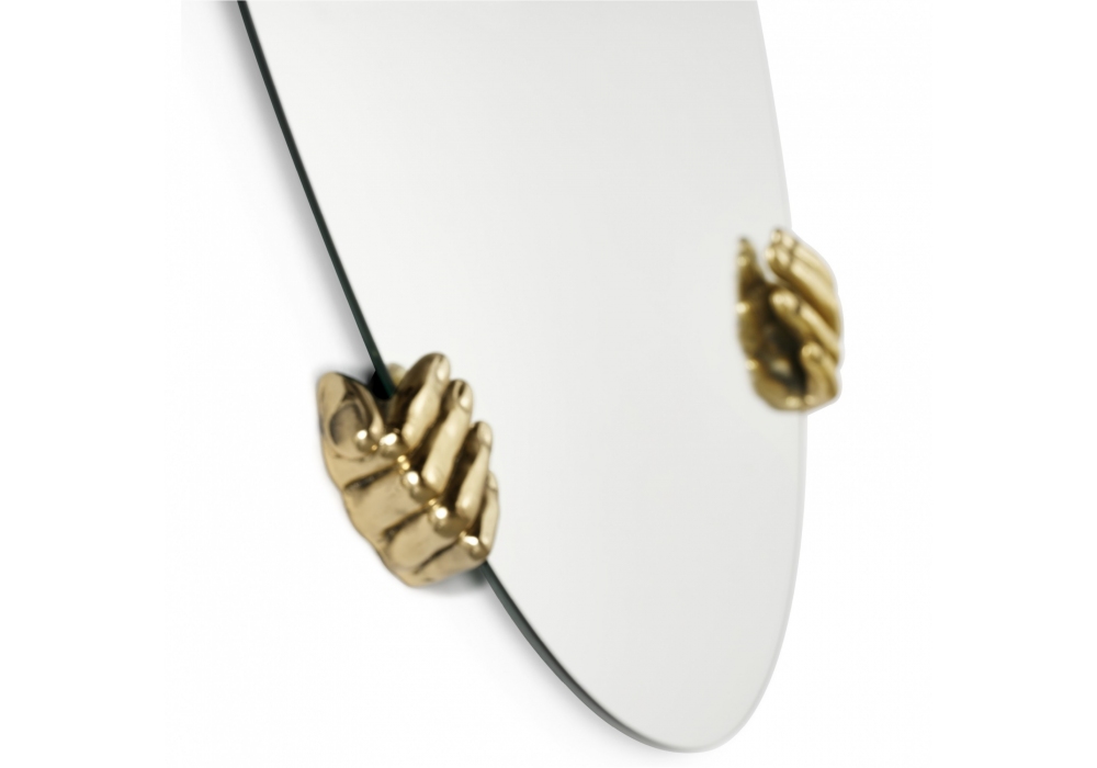 Selfie designed by Alessandra Baldereschi for mogg is a wall mirror with decorative hands in cast brass. It is possible to fix the hands in different, but pre-established, positions. The square mirror includes 1 hand, the oval 2 hands, the rectangular 4 hands, the round 6 hands.