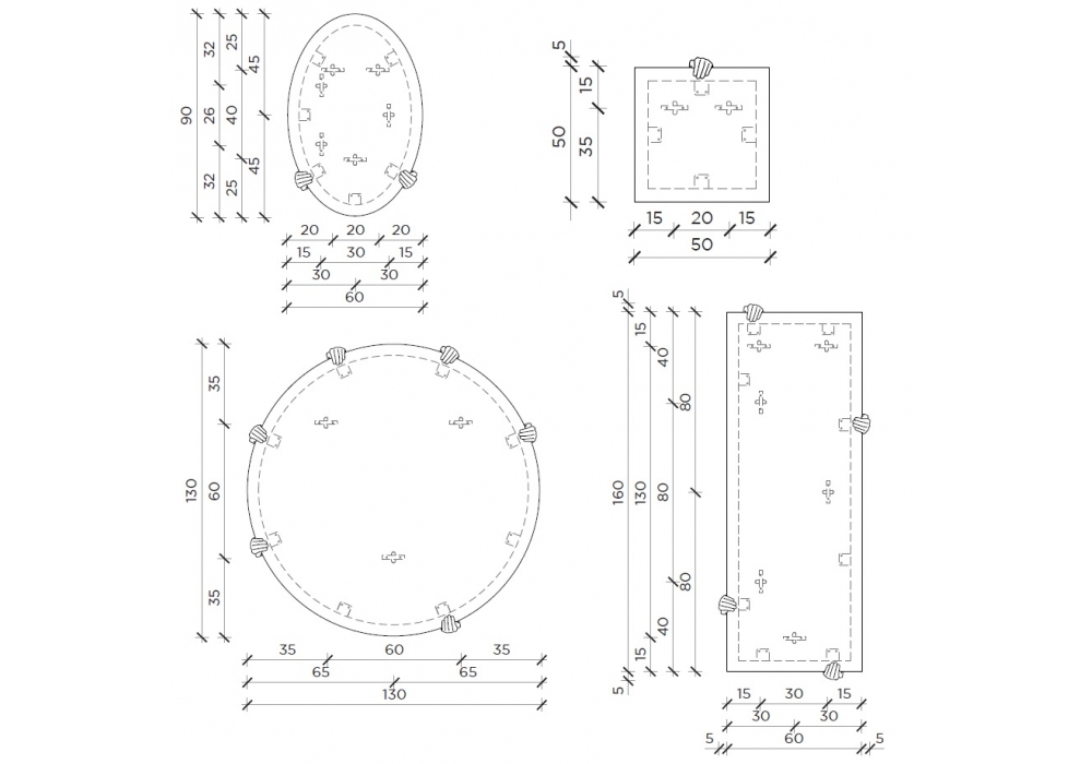 | Dimensions | Square 50 x 50 cm; Oval 90 x 60 cm; Rectangular 160 x 50; Rounf Ø 130 cm |