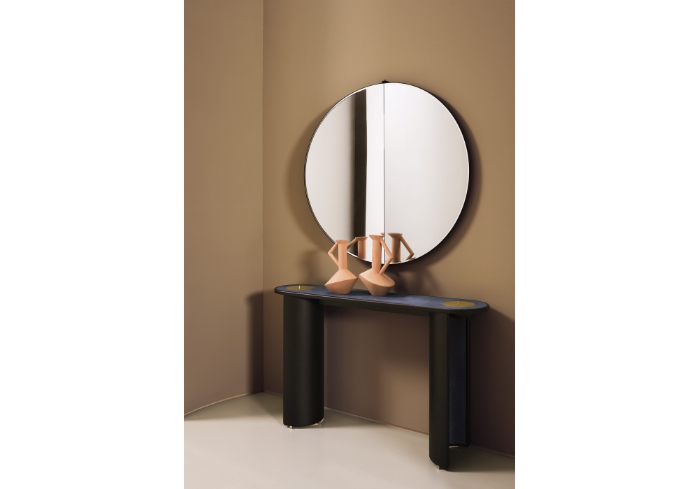 Peris designed by Pietro Russo for Baxter is a mirror with swivel structure in matt black painted metal with details in satin brass with matt varnish. Rear aluminum sheets with leather upholstery.