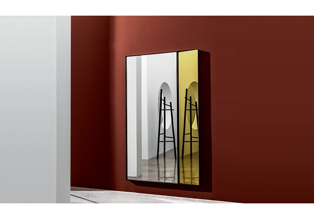 Campos designed by Altherr Desile Park for Sovet is a mirror made with an aluminum frame lacquered in burnished brass, coffee or black finishes. Available in different finishes.