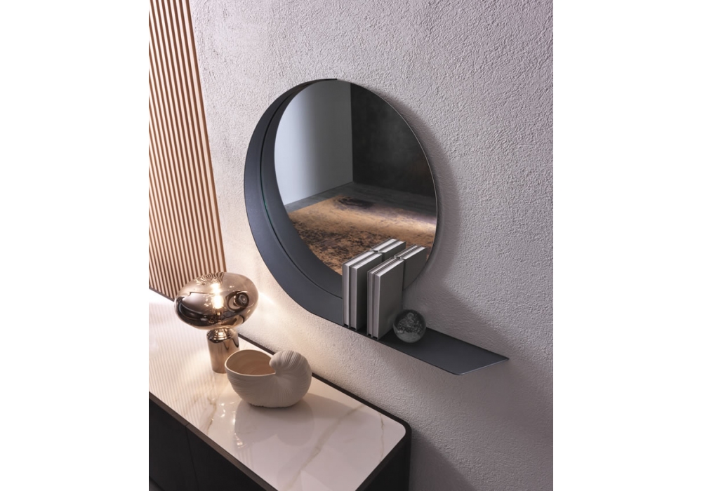 Madame designed by Riflessi is a round mirror with right shelf frame in painted metal. Available in 3 finishes.