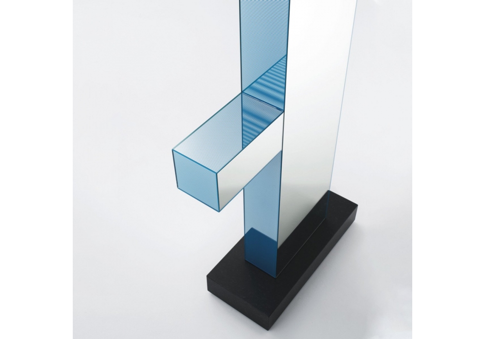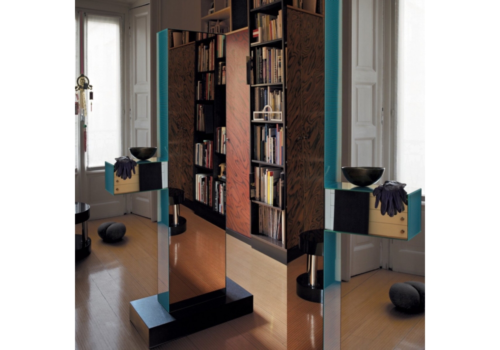 Shibam 1 designed by Ettore Sottsass for Glas Italia is a totem mirror with shelf for objects. the two sides are in white mirror while the sides are in mirror decorated with thin colored engravings (available in pink and blue). The base is in matt polished absolute black granite.