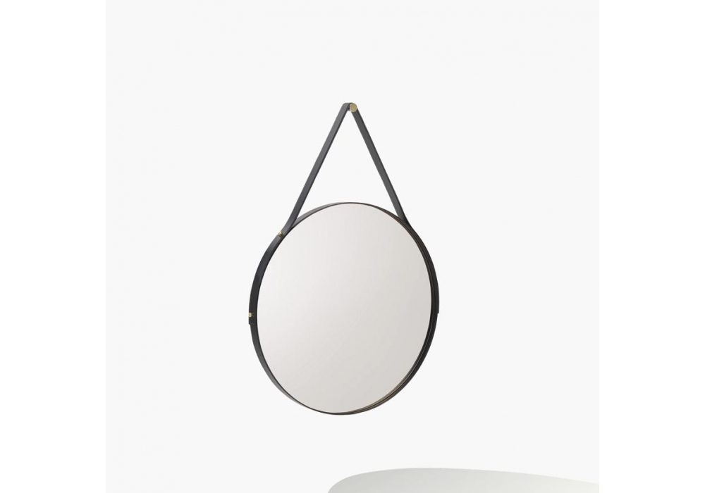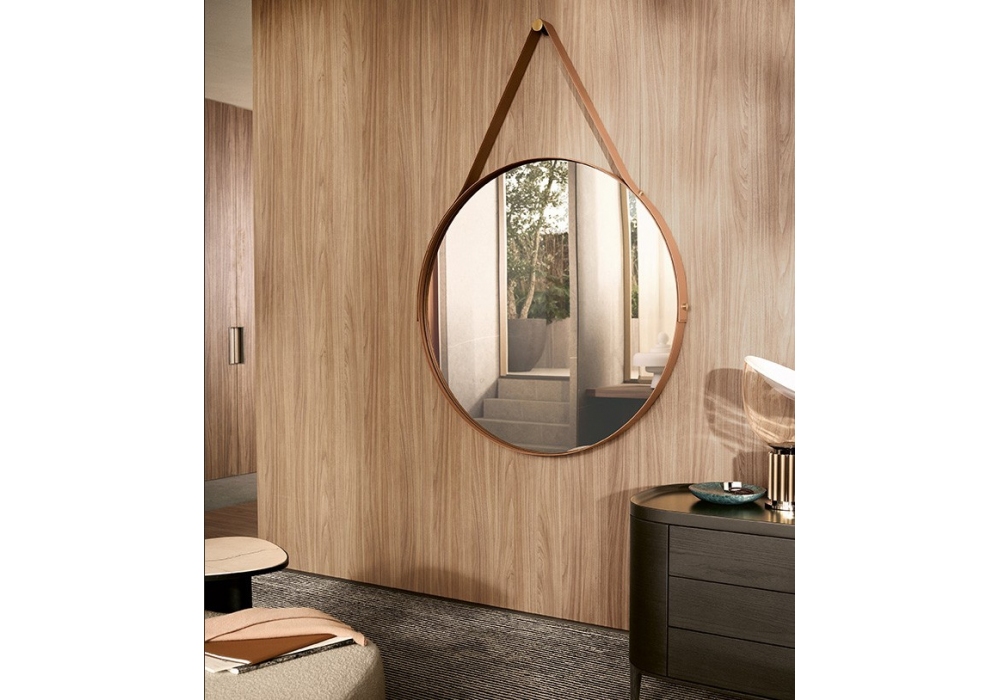 Drop designed by R&D Poliform is a circular mirror with structure in metall covered in hide and bronzed mirror.