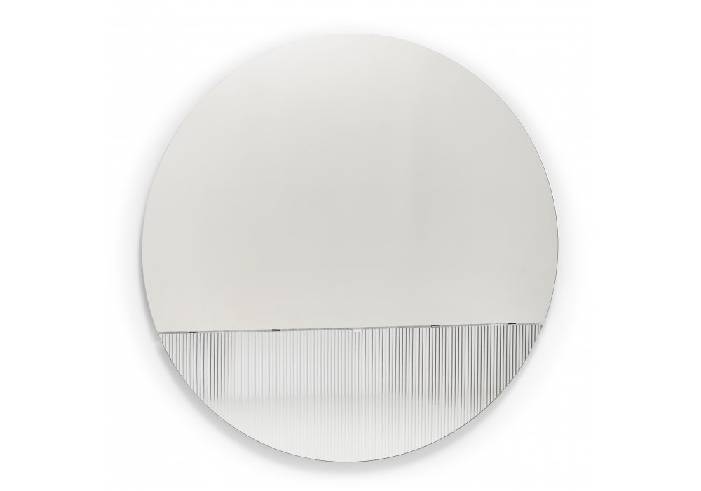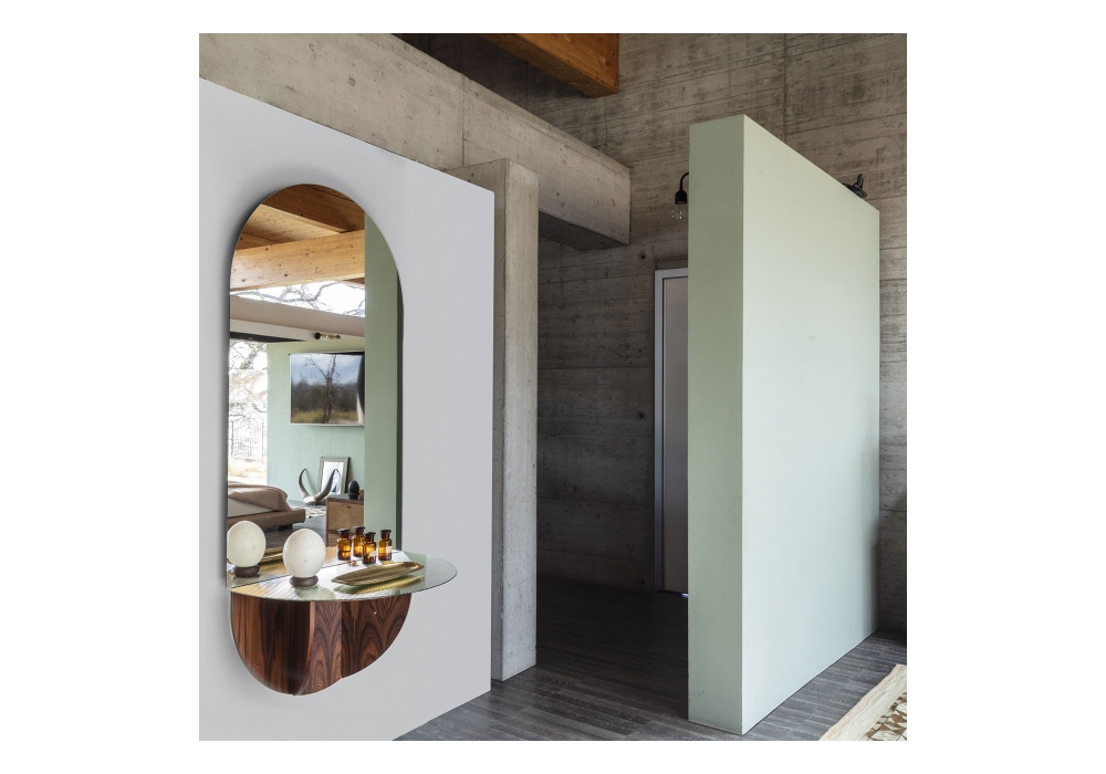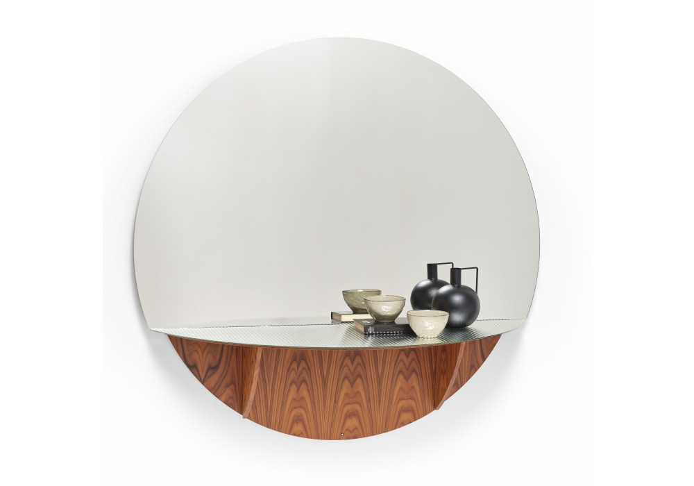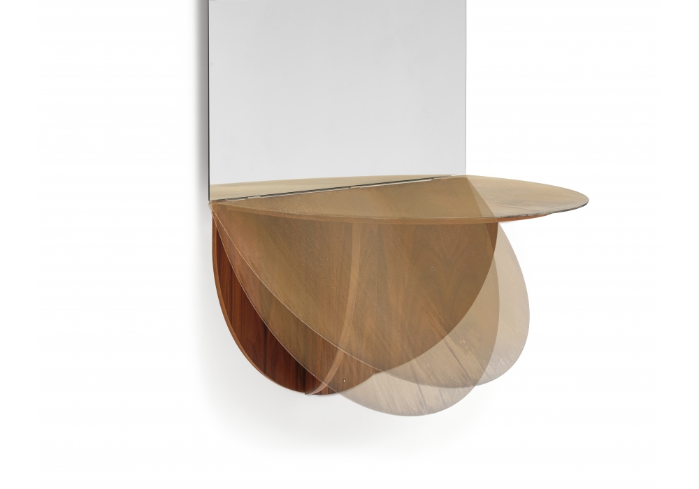 Brame designed by Claudio Bitetti for Mogg is a wall mirror with a folding top. The top has a structure in MDF plated in Santos Rosewood and a lower panel in caneté mirror glass or oxidized mirror glass. Requires wall fixing.