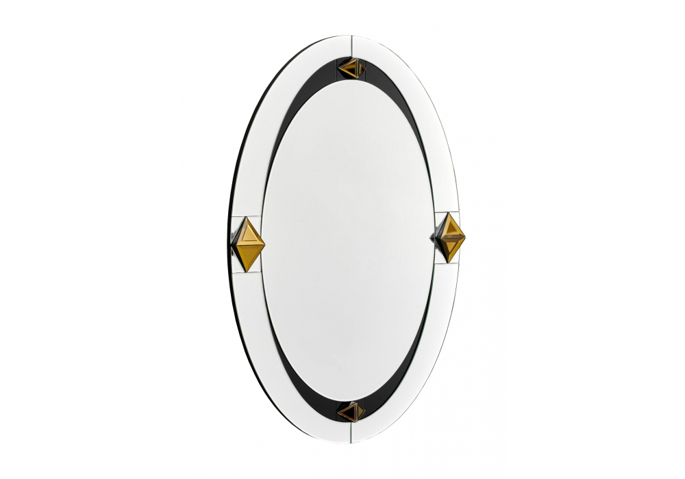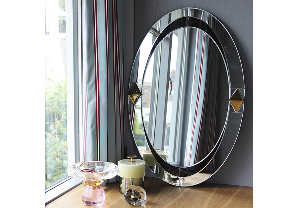 Darling produced and designed by Reflections Copenhagen is an oval mirror in faceted glass applied on a black painted MDF base. The mirror is enriched with details in silver and gold paint.